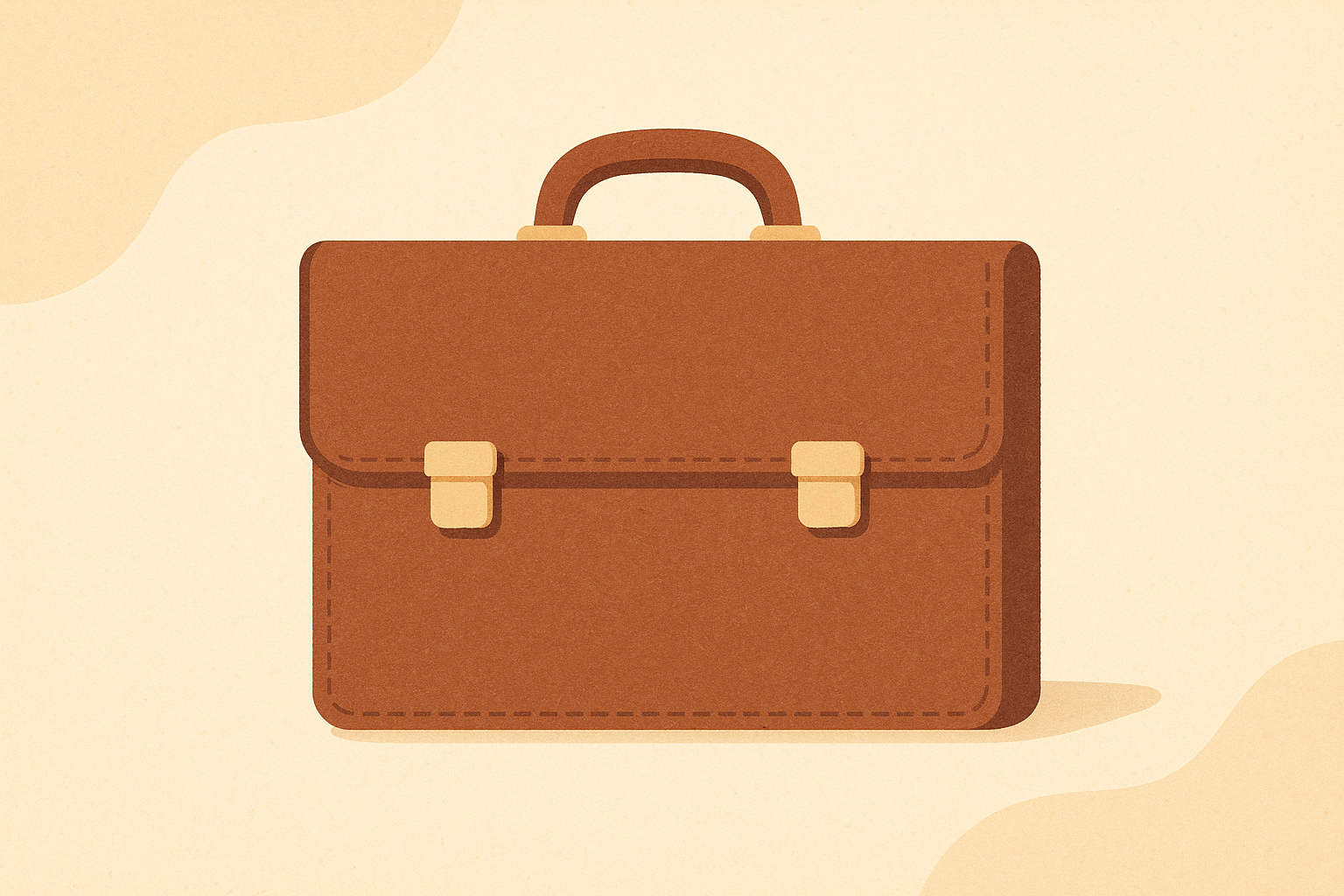 Illustration vectorielle dans des tons doux beige, brun et vert olive, représentant une mallette en cuir, des documents avec coche verte, des graphiques en barres, une icône dollar et une flèche ascendante. Style plat et épuré, ambiance professionnelle et chaleureuse, parfaite pour les thèmes de business, finance, croissance et organisation.