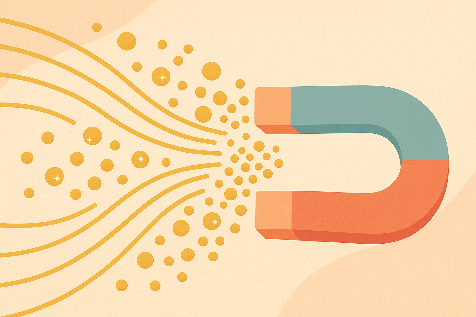 Illustration vectorielle d’un aimant rouge en forme de fer à cheval avec extrémités gris foncé, attirant des particules rondes jaunes et des lignes fluides beige clair sur fond crème texturé. Style minimaliste, couleurs douces et ambiance professionnelle dynamique. Parfait pour des visuels de communication, marketing ou innovation.