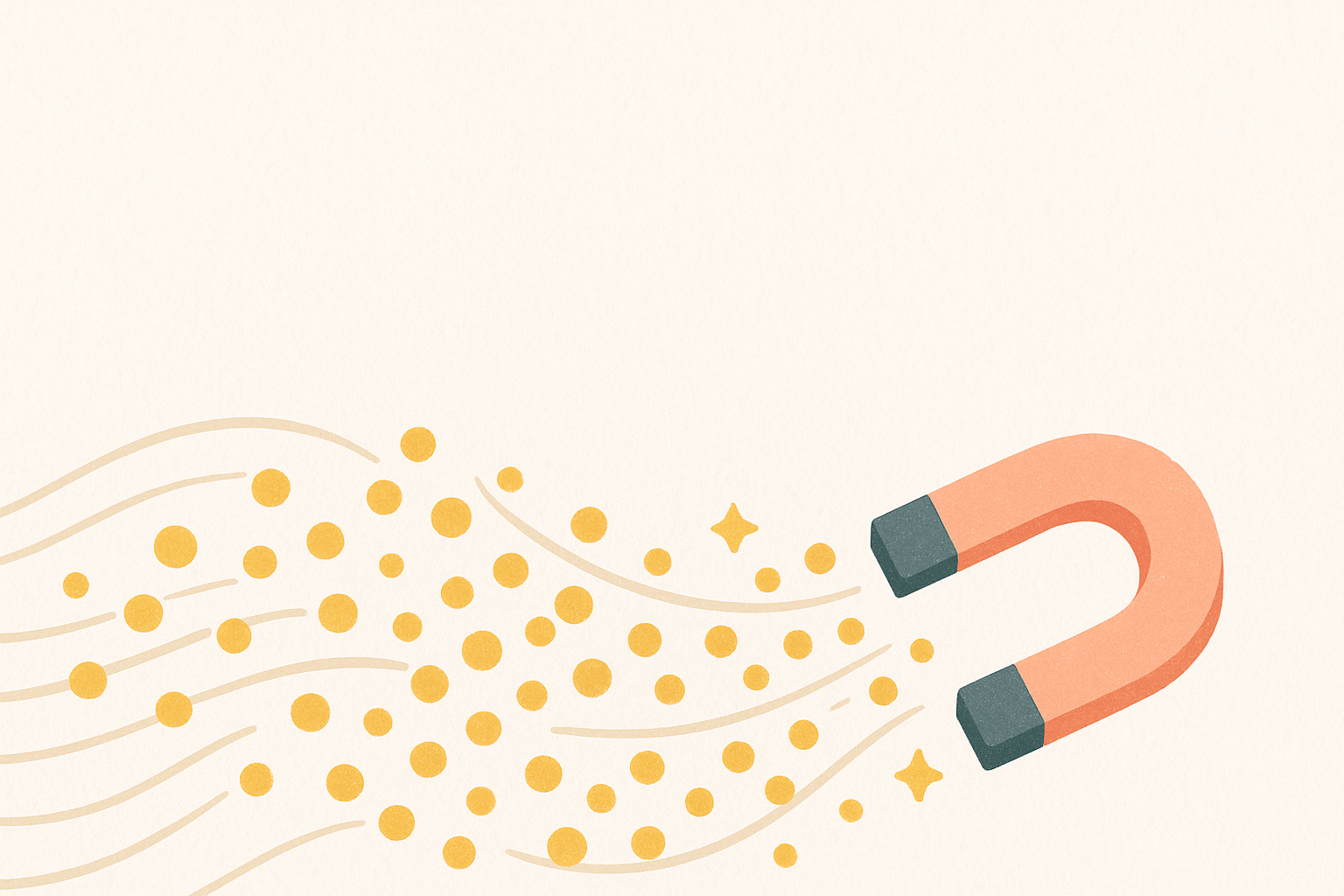Illustration vectorielle d’un aimant rouge en forme de fer à cheval avec extrémités gris foncé, attirant des particules rondes jaunes et des lignes fluides beige clair sur fond crème texturé. Style minimaliste, couleurs douces et ambiance professionnelle dynamique. Parfait pour des visuels de communication, marketing ou innovation.