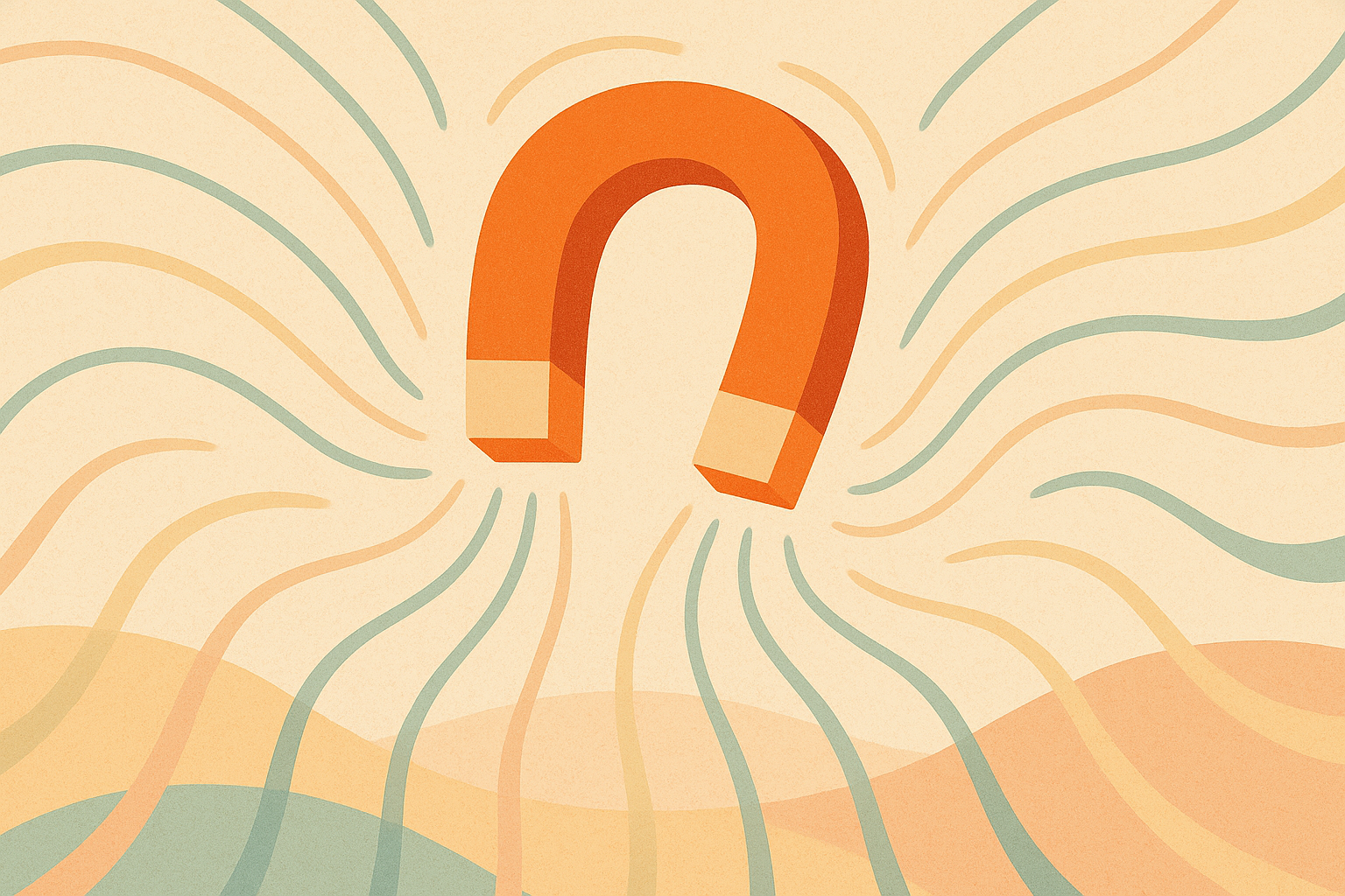 Illustration vectorielle au style plat avec une palette pastel douce incluant orange, vert, bleu et jaune. Éléments visuels : grand aimant en U, cible avec flèche, fusée, ampoule, plante en pot, étoile, avion en papier, formes abstraites et symboles de croissance. Design épuré et professionnel, parfait pour des supports de communication d'entreprise.