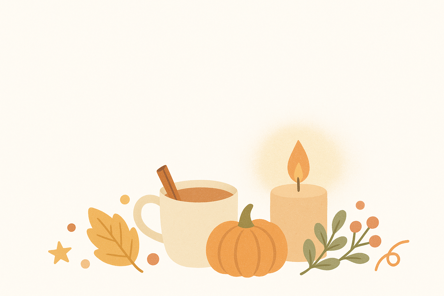 Illustration vectorielle dans des tons doux beige, orange et vert, représentant une tasse de boisson chaude avec bâton de cannelle, une bougie allumée, une petite citrouille, des feuilles d'automne, des baies rouges et des éléments décoratifs. Style minimaliste et pastel, ambiance cosy et saisonnière, parfaite pour l'automne.