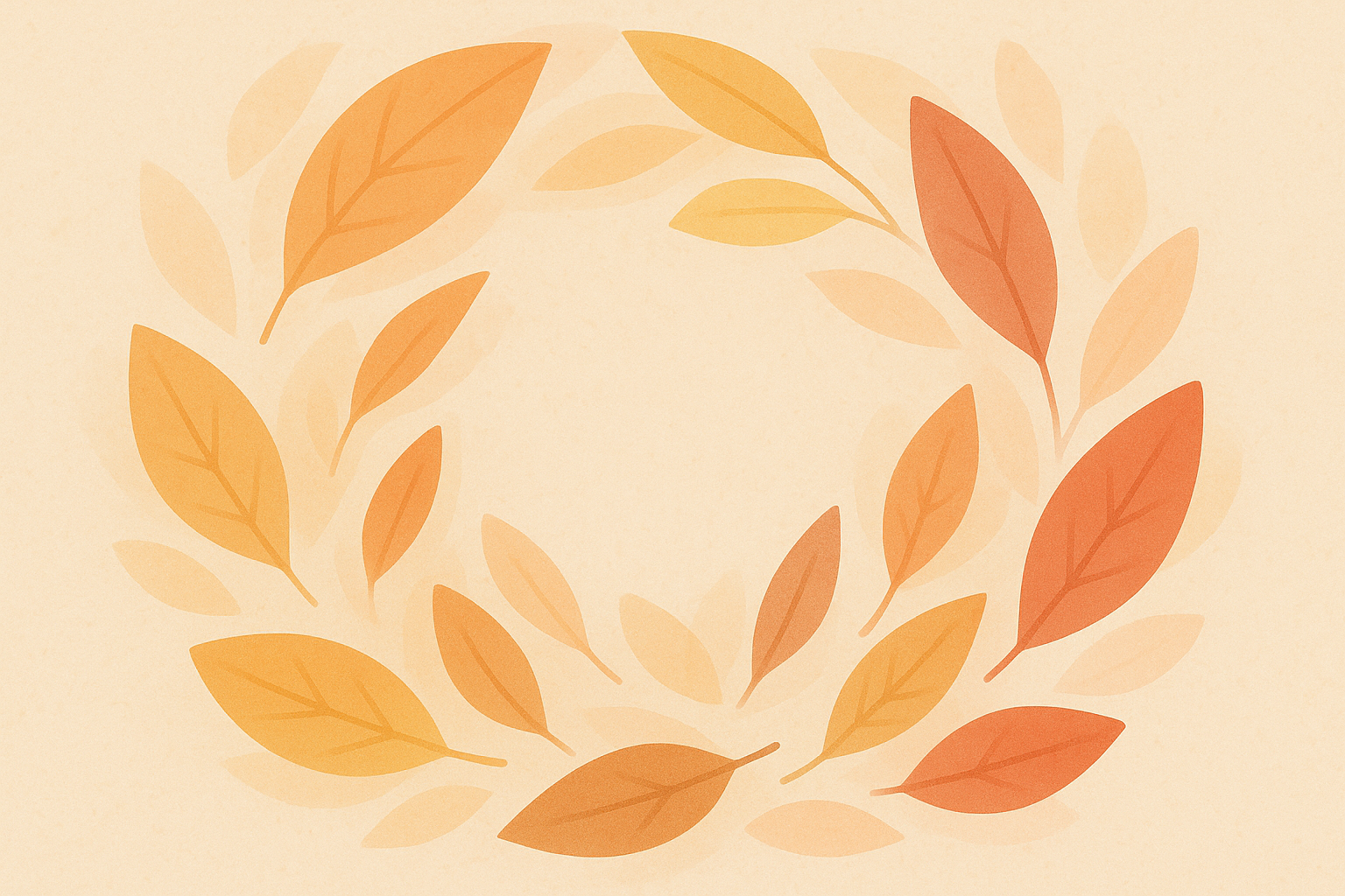 Fond dégradé jaune orangé avec des éléments en papier découpé : tasse fumante, livre, bougie allumée, feuille d’érable, bâton de cannelle, citrouille et feuilles d’automne. Style chaleureux, doux et texturé, aux teintes chaudes (orange, ocre, brun, crème) évoquant l’automne et la convivialité. Composition centrée en bas, laissant un grand espace vide pour le texte ou le message.
