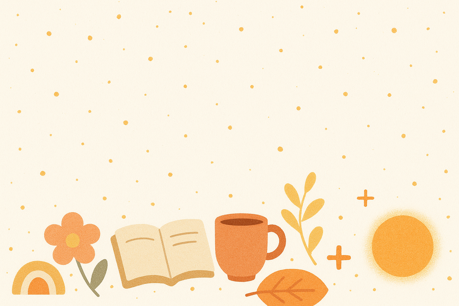Fond crème parsemé de pois orange doux, avec illustrations vectorielles en bas : fleur orange, arc-en-ciel stylisé, livre ouvert beige, tasse orange, feuille d'automne, branches jaunes et soleil diffus. Style minimaliste et pastel, ambiance cosy et automnale, palette chaude avec des tons terreux et orangés.