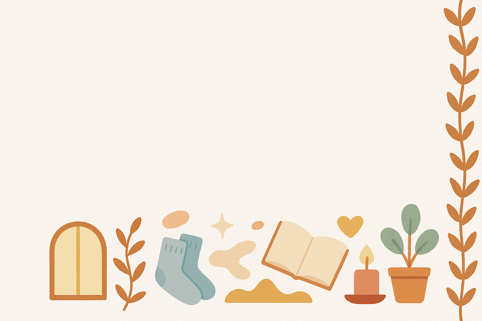 Illustration minimaliste avec des éléments visuels doux : chaussettes bleues, livre ouvert, plante verte en pot, bougie orange, cœur jaune, porte arrondie, feuilles brunes et formes abstraites. Palette de couleurs pastel avec des tons beige, terracotta, vert sauge et bleu doux. Style épuré et chaleureux, parfait pour ambiance cosy et professionnelle.