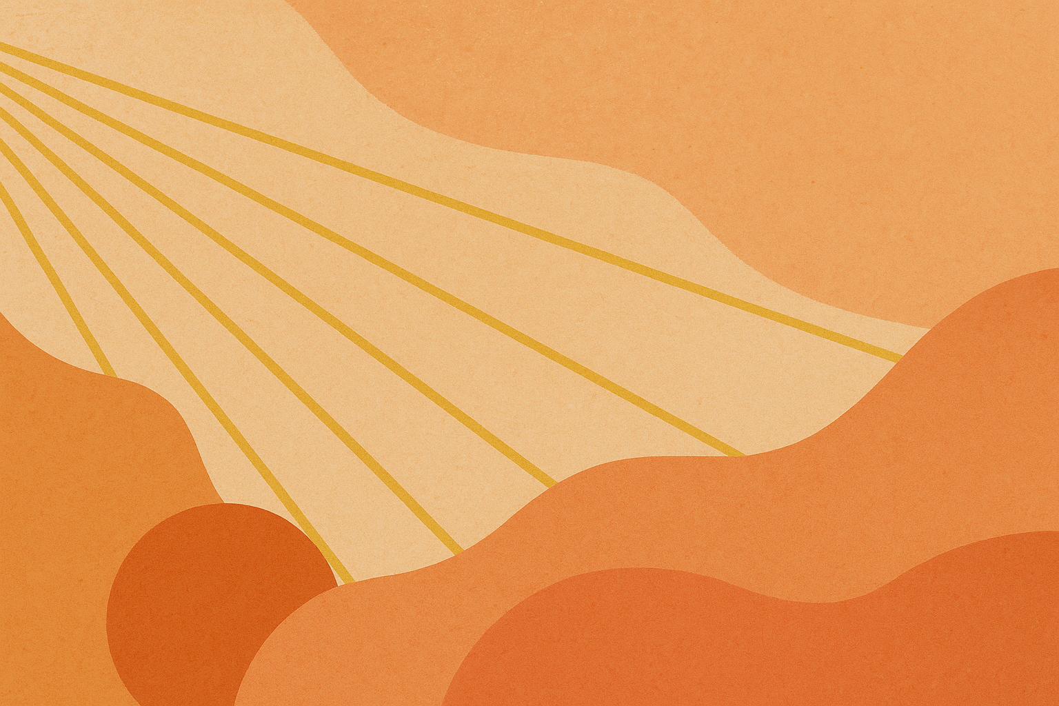 Illustration minimaliste aux tons chauds beige, ocre, terracotta et jaune doux. Éléments visuels : plante en pot, tasse fumante, livre ouvert, vase avec feuillage, bougie allumée, plaid, rayons de soleil stylisés, formes abstraites. Style épuré et cosy, ambiance de bureau calme et inspirante, parfaite pour la correspondance professionnelle.