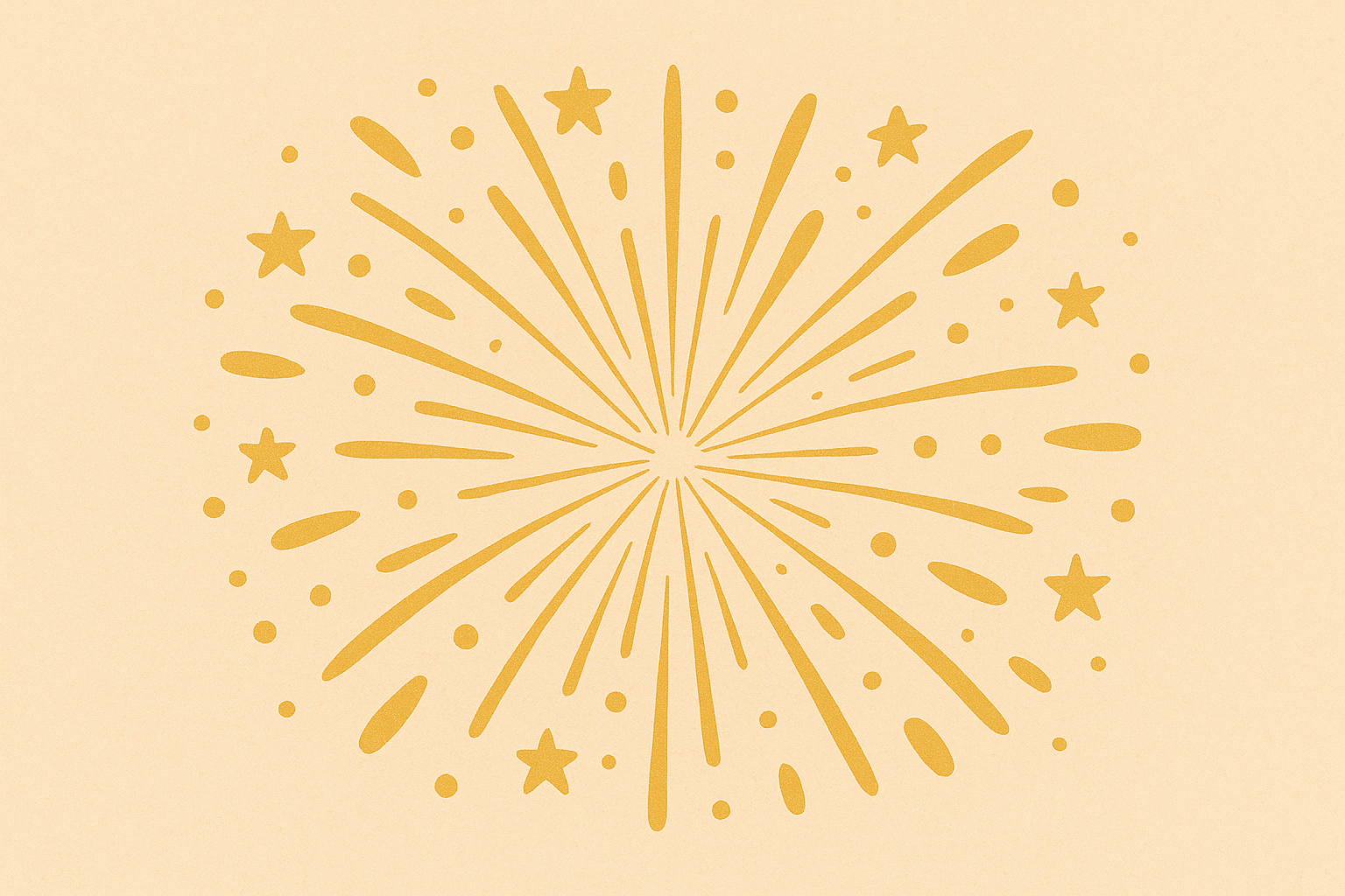 Illustration minimaliste aux tons chauds beige, ocre, terracotta et vert olive, représentant une platine vinyle, une tasse fumante, une plante, un livre ouvert, une lampe, une théière et des éléments décoratifs comme étoiles, cœurs et fleurs. Style épuré et doux, ambiance cosy et professionnelle, parfaite pour un fond de carte postale de correspondance d'affaires.