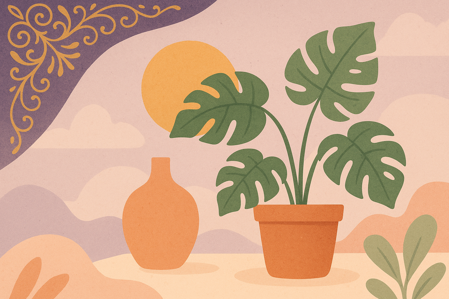 Illustration minimaliste avec palette de couleurs douces et naturelles : beige, terracotta, jaune moutarde et bleu-gris. Éléments visuels : tasse de café, livre ouvert, bougie allumée, lunettes, plante en pot, arcs-en-ciel stylisés, étoiles et cœurs. Style épuré et chaleureux, ambiance cosy et professionnelle, parfaite pour un fond de carte postale de bureau.