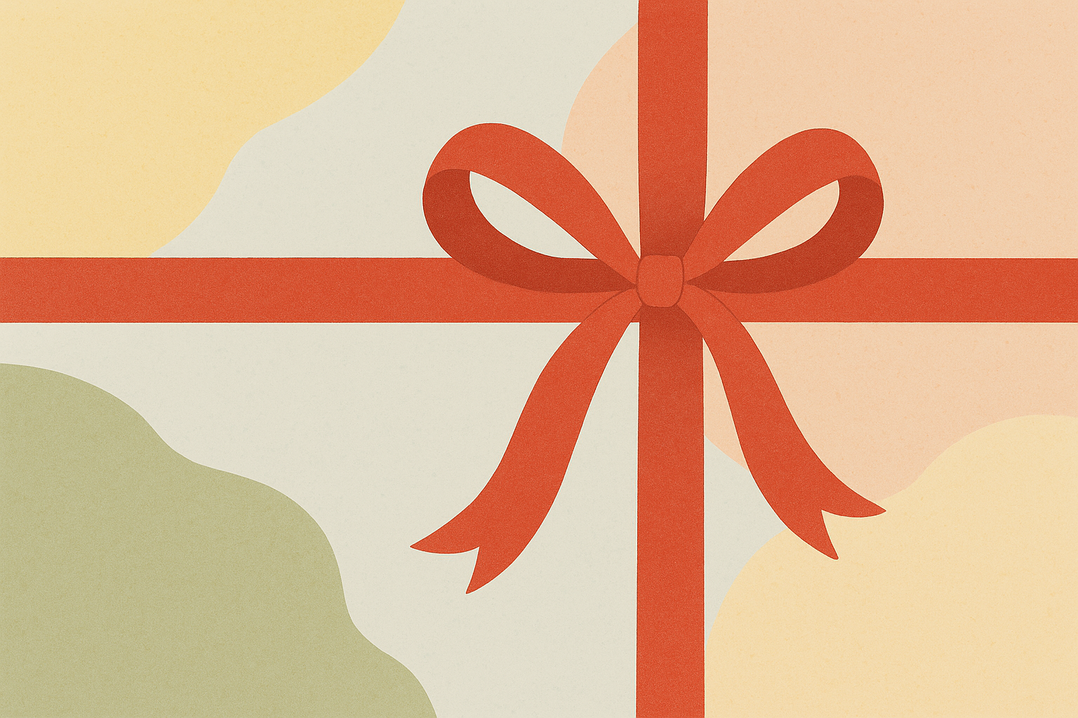 Illustration minimaliste aux tons pastel chauds (beige, terracotta, bleu doux) représentant une scène cosy avec fauteuil, tasse fumante, lampe, livre ouvert, plante, cadre et arc-en-ciel stylisé. Éléments plats et épurés, ambiance chaleureuse et professionnelle, parfaite pour fond de carte postale de correspondance d'affaires.