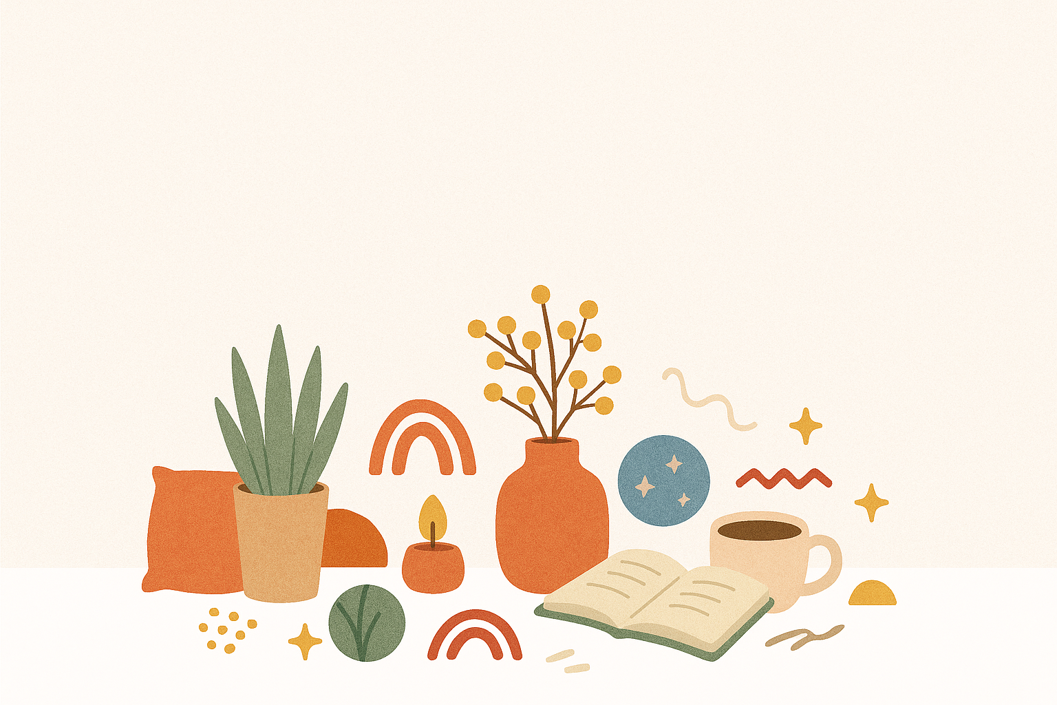 Illustration vectorielle au style minimaliste et pastel avec des éléments décoratifs comme une plante verte, un coussin orange, une bougie, un livre ouvert, une tasse de café, un vase orange avec des fleurs jaunes, des arcs-en-ciel rouges, des étoiles dorées et des formes abstraites. Palette de couleurs douces : beige, vert olive, terracotta, jaune moutarde et bleu doux. Composition équilibrée en bas de l'image avec un grand espace vide en haut pour le texte.