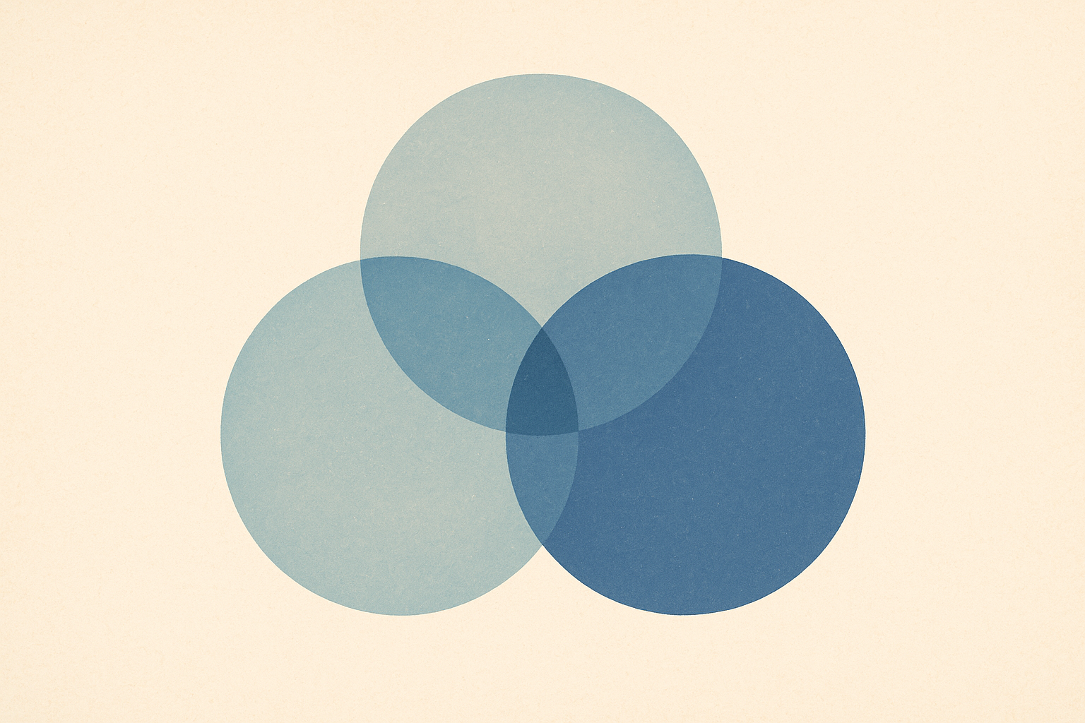 Illustration minimaliste avec des éléments visuels plats et doux : plante verte en pot, tasse jaune, livre ouvert, bougie allumée, fleur bleue, formes abstraites et symboles graphiques. Palette de couleurs pastel et terreuses (vert olive, ocre, bleu-gris, beige). Style épuré et chaleureux, parfait pour un fond de carte postale professionnelle.
