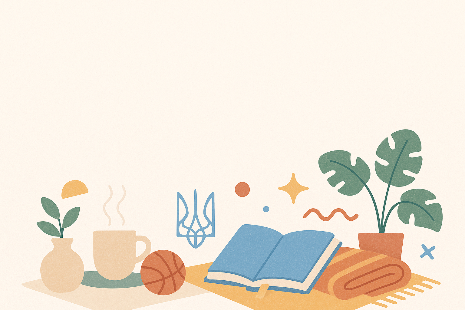Illustration vectorielle au style minimaliste avec des tons pastel doux (beige, bleu, vert, orange). Éléments visuels : plante en pot, livre ouvert bleu, tasse fumante, vase, ballon de basket, couverture pliée, formes abstraites et symboles décoratifs. Composition équilibrée évoquant une ambiance de bureau cosy et inspirante, idéale pour une communication visuelle professionnelle.