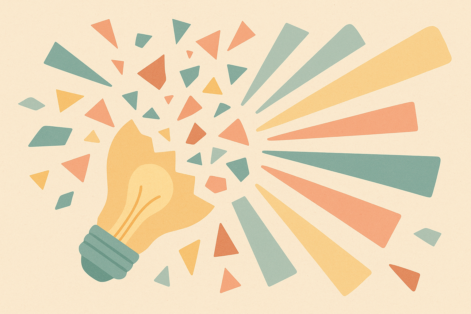 Illustration vectorielle sur fond crème avec une ampoule jaune stylisée au centre, entourée d’éclats géométriques multicolores (triangles, carrés, ronds) en tons pastel de corail, vert sauge, rose et jaune. Des formes abstraites végétales en bas ajoutent une touche organique. Style plat, moderne et minimaliste, évoquant la créativité, l’énergie et l’innovation.