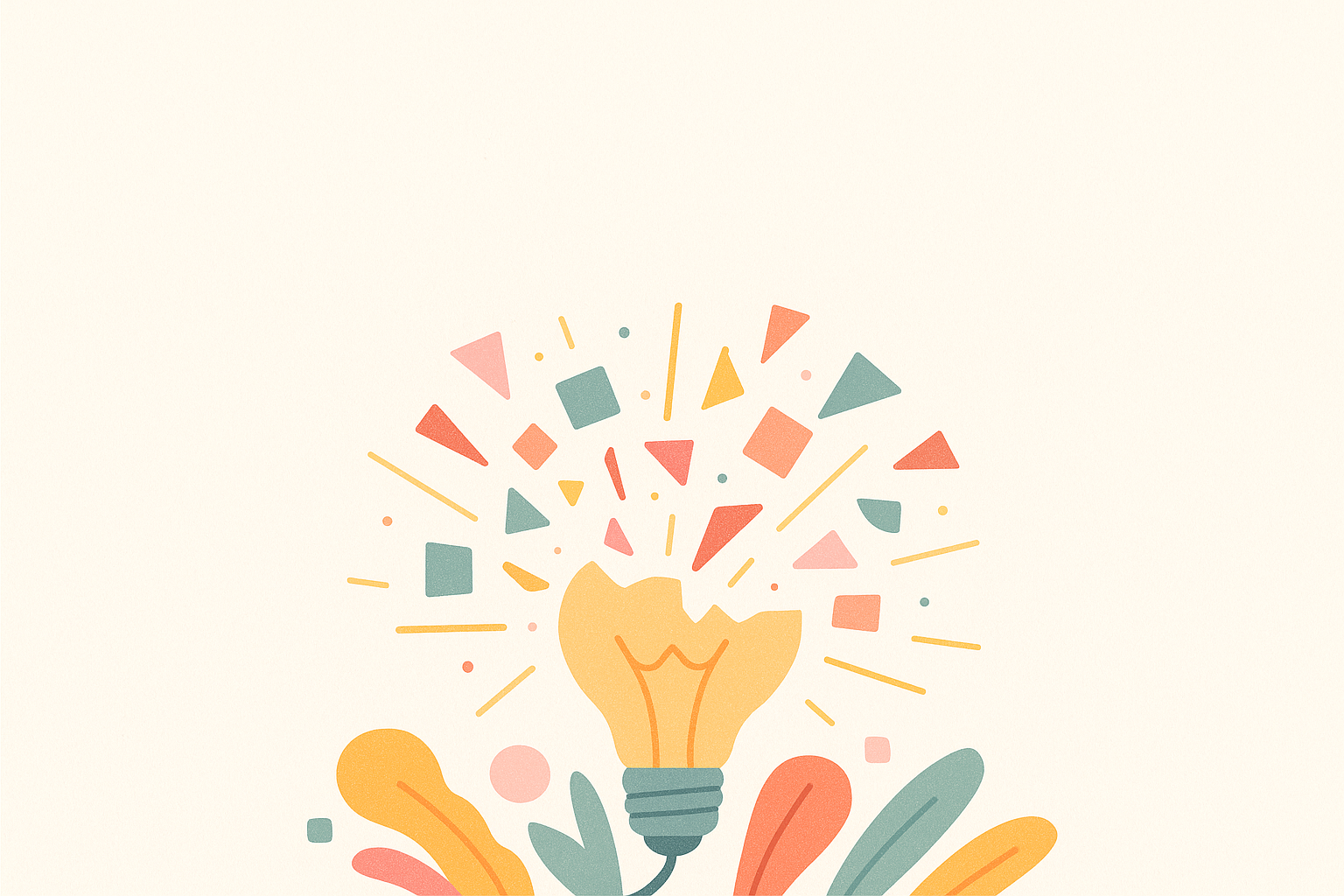 Illustration vectorielle sur fond crème avec une ampoule jaune stylisée au centre, entourée d’éclats géométriques multicolores (triangles, carrés, ronds) en tons pastel de corail, vert sauge, rose et jaune. Des formes abstraites végétales en bas ajoutent une touche organique. Style plat, moderne et minimaliste, évoquant la créativité, l’énergie et l’innovation.