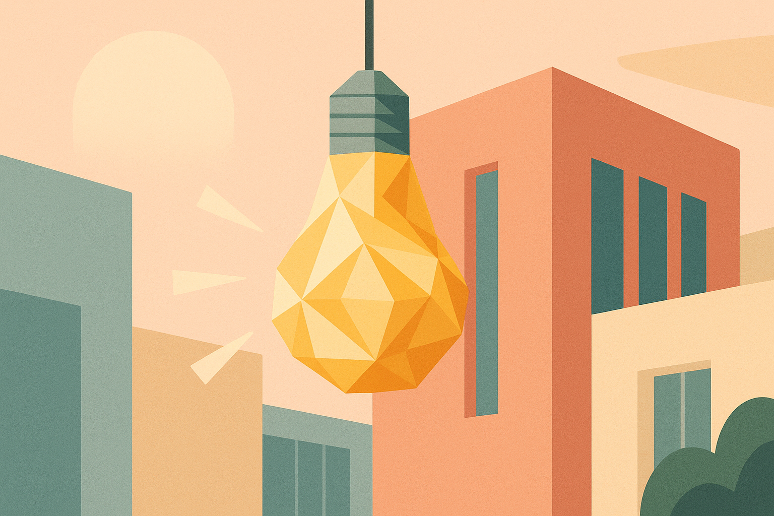 Illustration vectorielle avec une ampoule polygonale jaune suspendue au centre sur fond beige clair, entourée en bas de pictogrammes minimalistes en tons pastel (vert sauge, orange terre cuite, jaune sable, bleu doux). Éléments visuels incluant feuilles, vase, règle, ordinateur, formes abstraites et architecture stylisée. Style graphique plat, moderne et épuré, idéal pour ambiance professionnelle et créative.