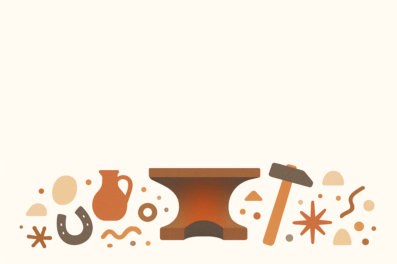 Illustration vectorielle minimaliste avec enclume, marteau, fer à cheval, poterie et formes abstraites dans des tons terre cuite, beige, brun et ocre. Style plat et épuré, ambiance artisanale et traditionnelle, fond crème uni avec éléments décoratifs en bas de l'image. Convient pour thèmes de travail manuel, artisanat, métiers anciens ou industrie créative.