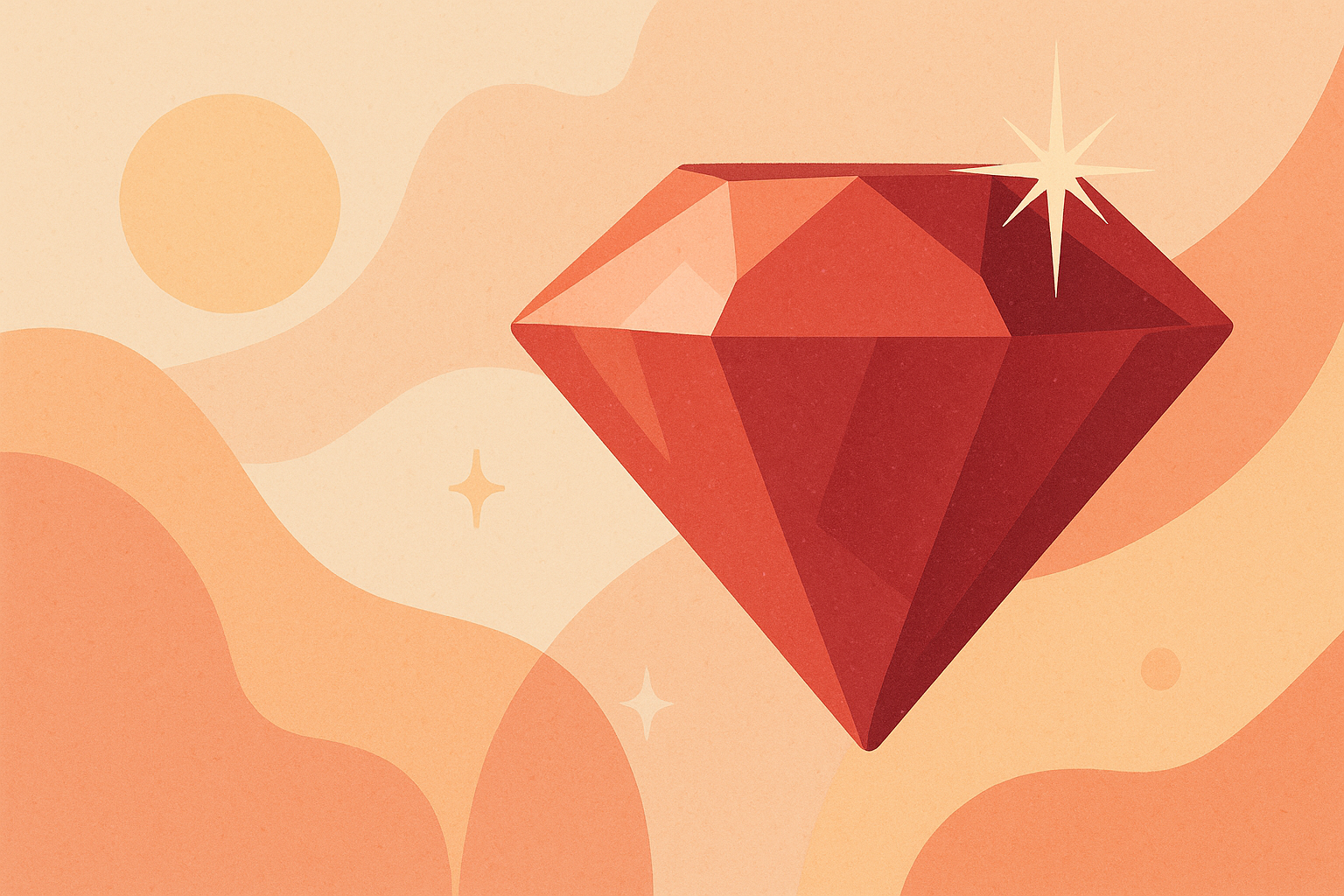Illustration minimaliste sur fond beige clair avec un grand diamant rouge en haut à droite, entouré d’éléments stylisés comme un flacon de parfum, un collier de perles, une bague dorée, un écrin, un nœud rose pâle et des formes abstraites. Palette douce en tons crème, or, pêche et rouge rubis, style vectoriel plat et épuré, ambiance luxe et élégance discrète.