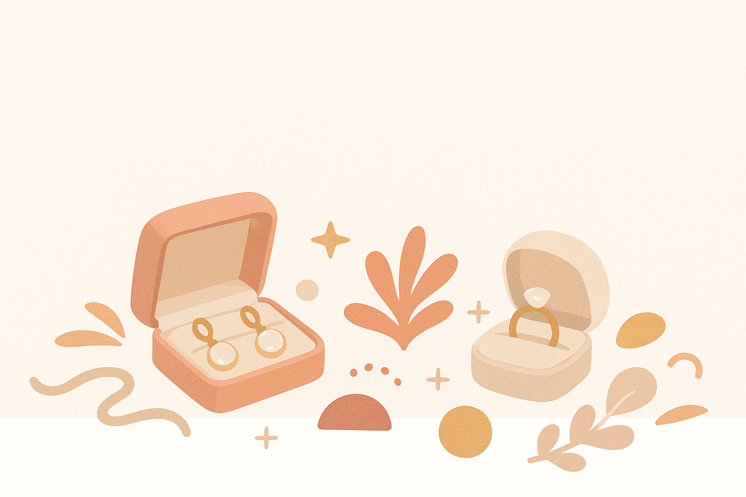 Illustration douce en tons pastel beige, rose saumon et ocre, représentant deux écrins à bijoux ouverts contenant une bague et des boucles d’oreilles. Des éléments décoratifs abstraits comme des feuilles stylisées, des étoiles, des points et des formes organiques entourent les boîtes. Style minimaliste et chaleureux, parfait pour un fond de carte postale élégant et professionnel.