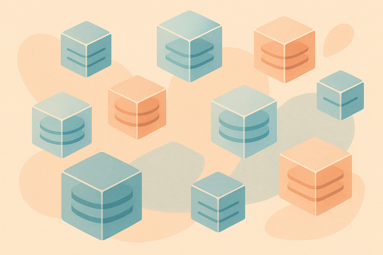Illustration vectorielle abstraite avec des blocs empilés bleu-gris, formes géométriques arrondies et éléments décoratifs pastel (orange doux, beige, bleu clair). Fond crème uni, style minimaliste et moderne avec effet texturé doux. Composition équilibrée évoquant technologie, organisation ou architecture de données.