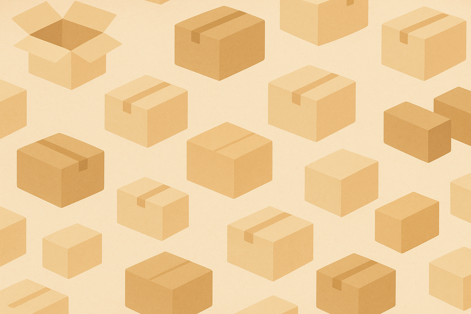 Illustration vectorielle de boîtes en carton de différentes tailles et nuances de beige, marron clair et ocre, disposées en bas de l'image sur un fond crème uni. Le style est plat et épuré, avec des formes géométriques simples et des ombrages doux. L'ensemble évoque la logistique, l'emballage et l'expédition dans un ton professionnel et moderne.
