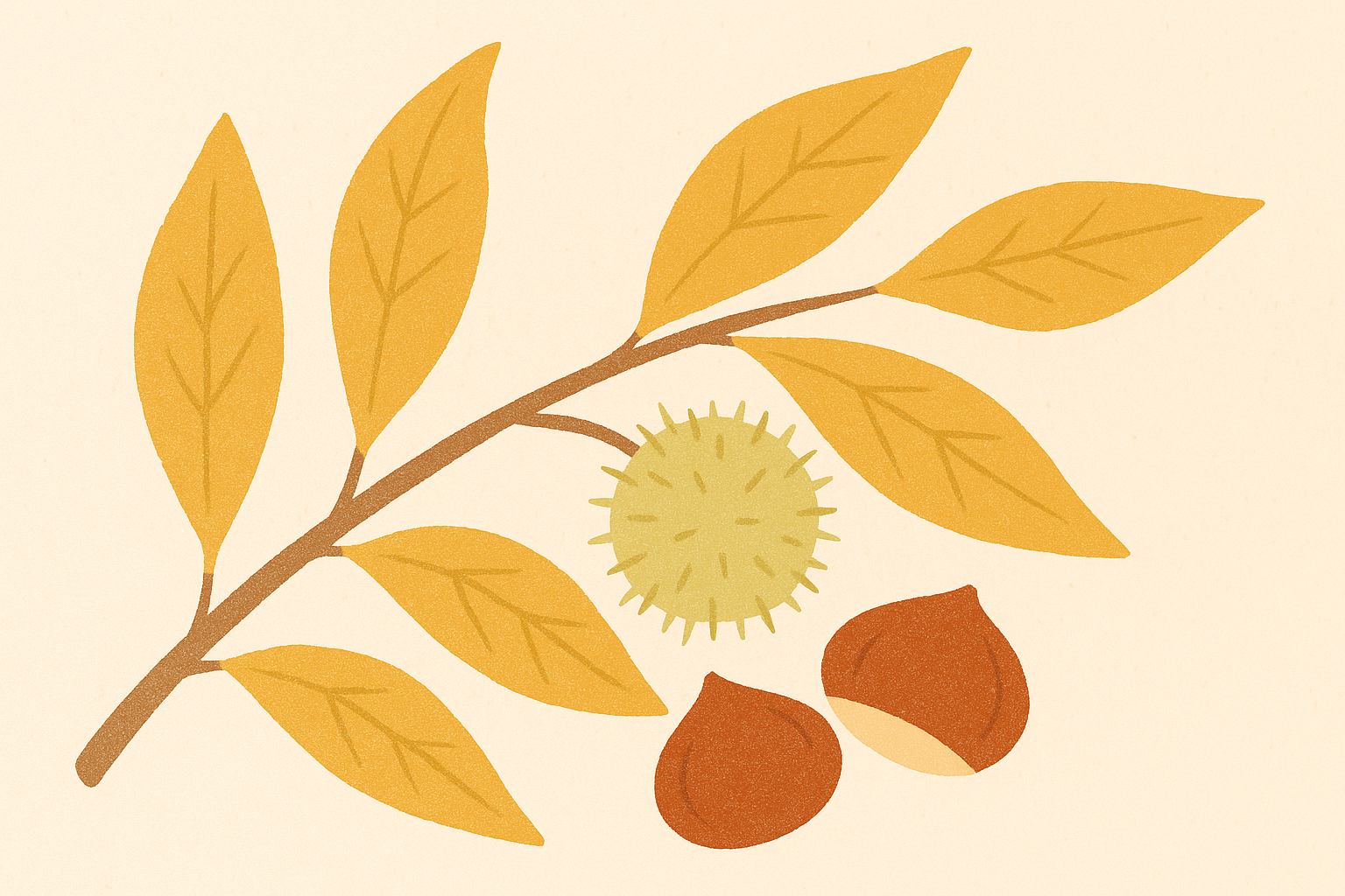 Illustration minimaliste d'une branche avec des feuilles ocre et jaunes, accompagnée de deux noisettes stylisées sur un fond crème texturé. Le style est plat, avec des formes simples et des couleurs automnales douces, parfait pour une ambiance naturelle et professionnelle. L'ensemble évoque l'automne avec une esthétique épurée et contemporaine.