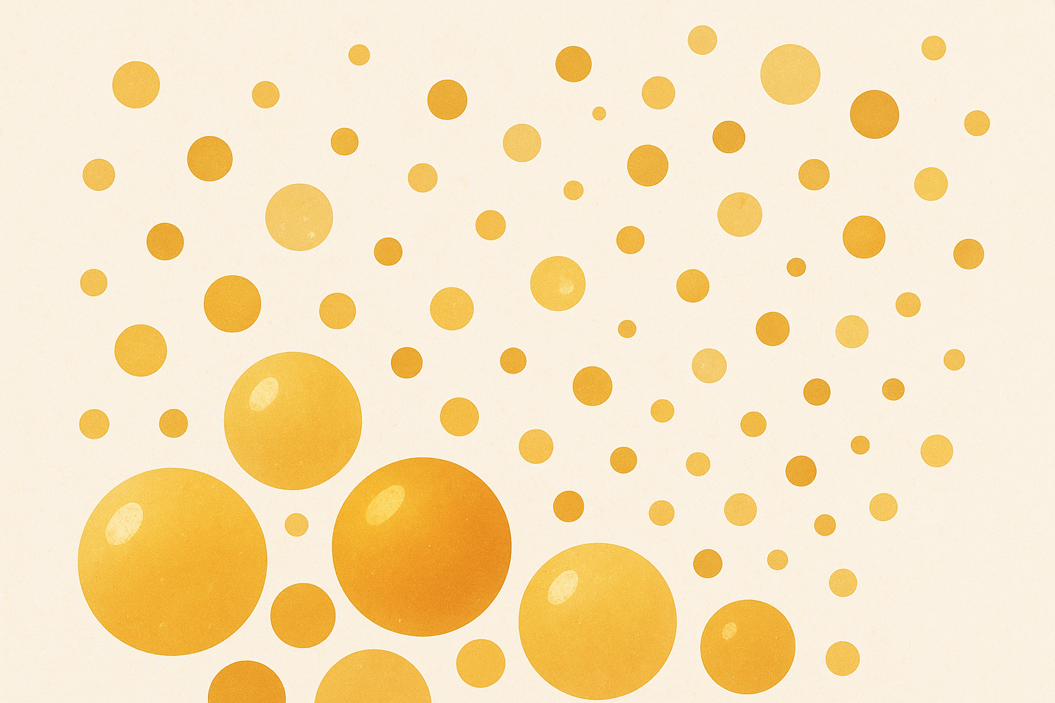 Motif de bulles dorées de tailles variées sur fond crème clair, disposées en dégradé montant depuis le bas. Les cercles sont uniformément répartis, créant un effet festif et lumineux. Style graphique minimaliste avec palette de couleurs chaudes jaune-orangé et blanc cassé, parfait pour un usage professionnel élégant.