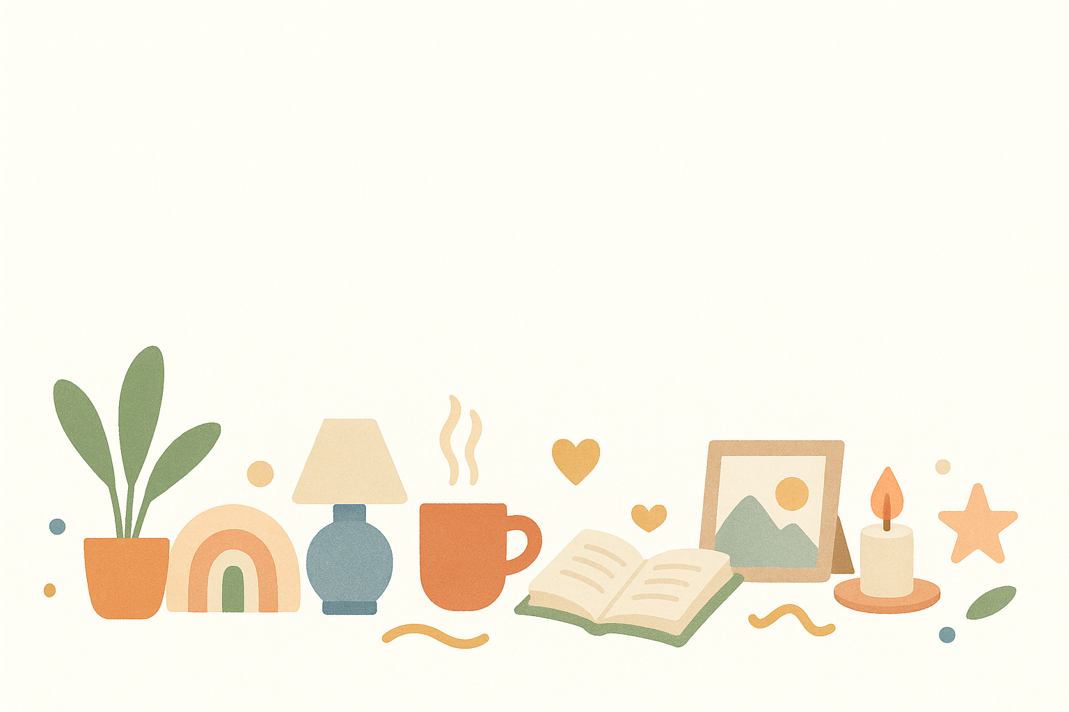 Illustration minimaliste aux couleurs pastel douces (vert olive, orange brûlé, beige, bleu-gris) représentant des objets de bureau cosy : plante en pot, lampe, tasse fumante, livre ouvert, cadre photo, bougie allumée et éléments décoratifs (cœurs, étoiles, formes abstraites). Fond crème uni avec composition centrée en bas, style plat et épuré, ambiance chaleureuse et apaisante.
