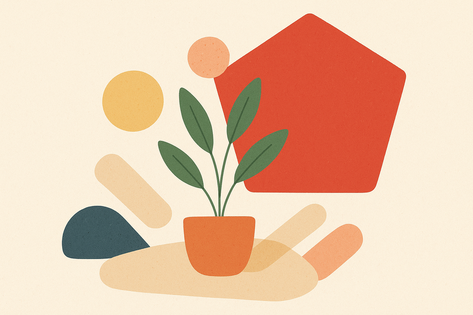 Illustration minimaliste avec des formes géométriques douces en tons chauds (rouge brique, beige, ocre, vert olive). Éléments visuels : tasse fumante, livre ouvert, lampe de bureau, enveloppe rouge, décor abstrait. Style plat et texturé, ambiance cosy et professionnelle, fond crème uni avec composition équilibrée en bas à droite.
