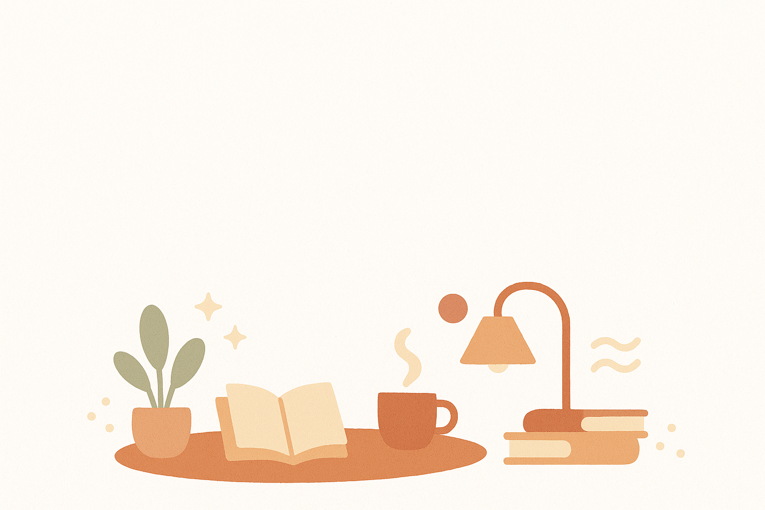 Illustration minimaliste aux tons chauds beige, terracotta et ocre, représentant un bureau avec une plante verte en pot, un livre ouvert, une tasse fumante, une lampe de bureau et des livres empilés. Style plat et épuré avec éléments décoratifs doux comme des étoiles et des lignes ondulées. Fond crème clair avec espace vide central pour texte ou message.