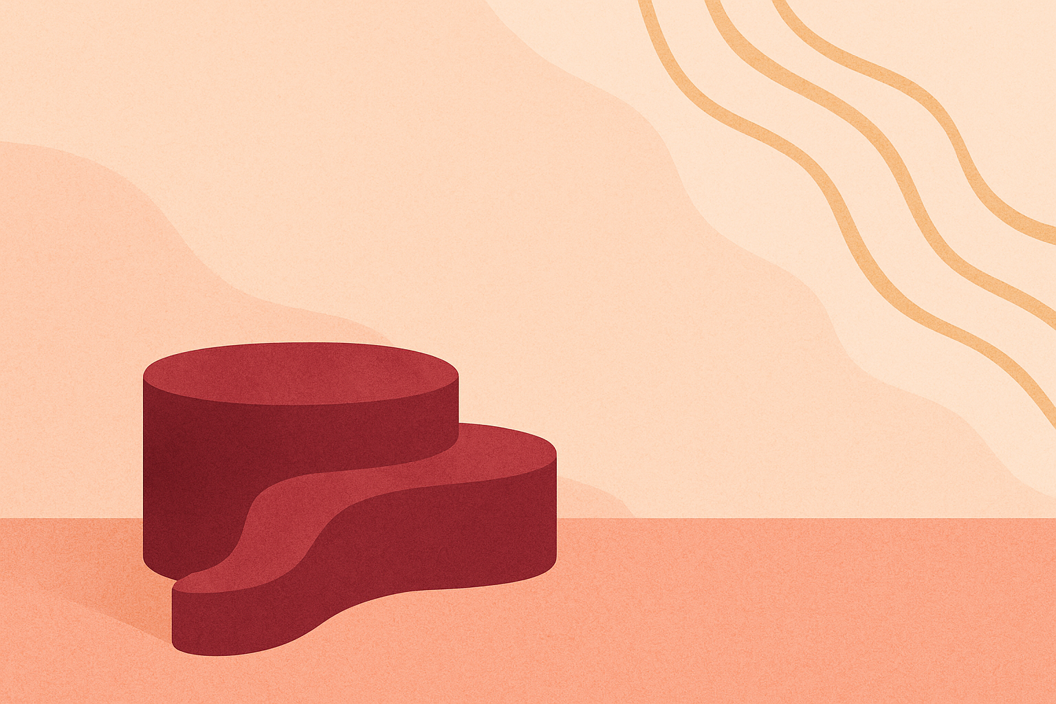 Illustration minimaliste dans des tons chauds beige, terracotta et orange, représentant un bureau avec une lampe champignon, une tasse de café fumante sur un livre, un pot de plante aux feuilles allongées, une fleur stylisée, une photo encadrée d’un arc-en-ciel et des formes abstraites. Style épuré, ambiance cosy et professionnelle, fond crème clair avec éléments graphiques doux et arrondis.