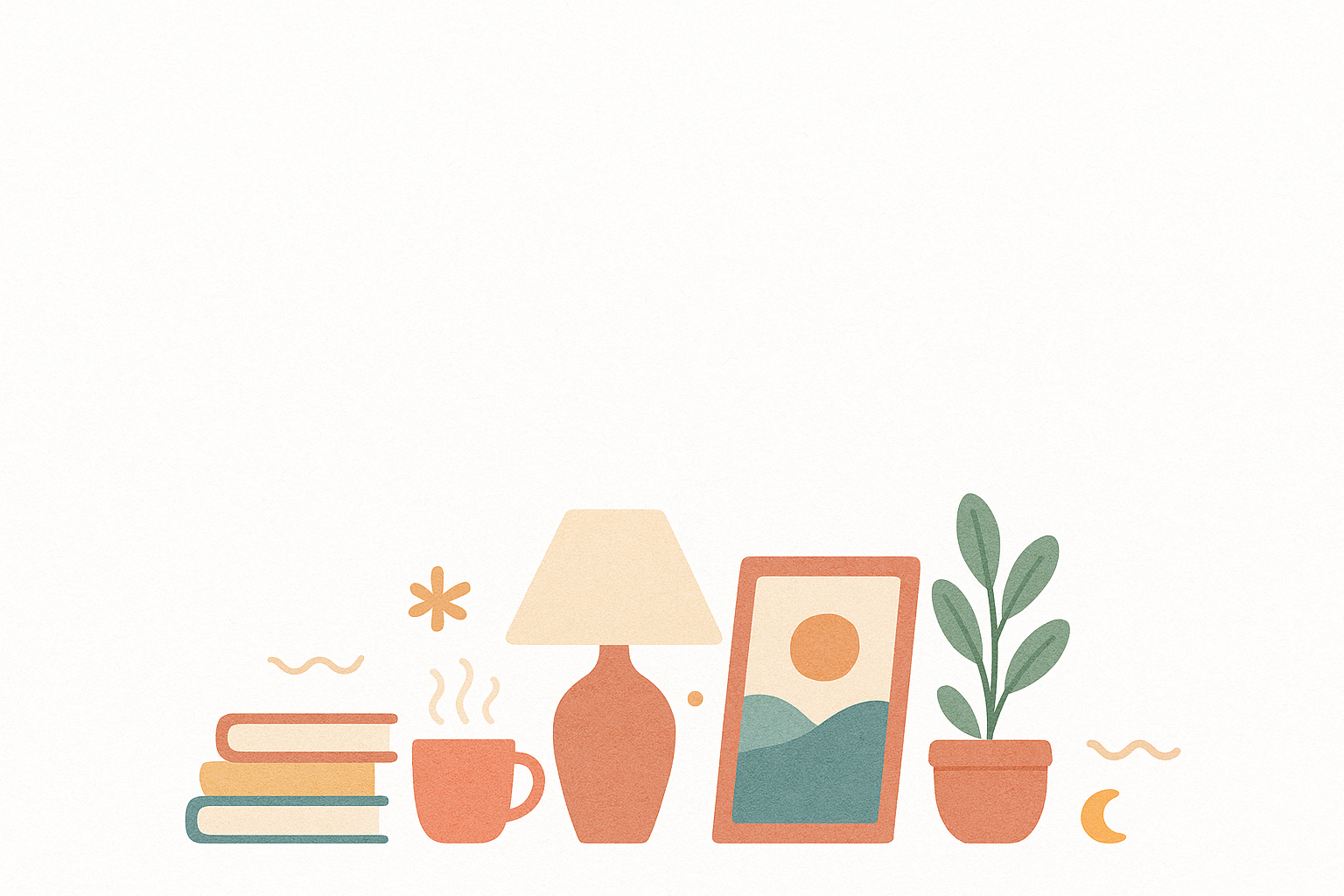 Illustration minimaliste avec des tons pastel doux (ocre, vert sauge, beige, terracotta) représentant une scène de bureau : pile de livres, tasse fumante, lampe de table, cadre avec paysage stylisé, plante verte en pot. Style épuré, formes simples et arrondies, ambiance cosy et professionnelle. Fond blanc avec éléments centrés en bas de l’image, laissant de l’espace pour du texte ou un message.
