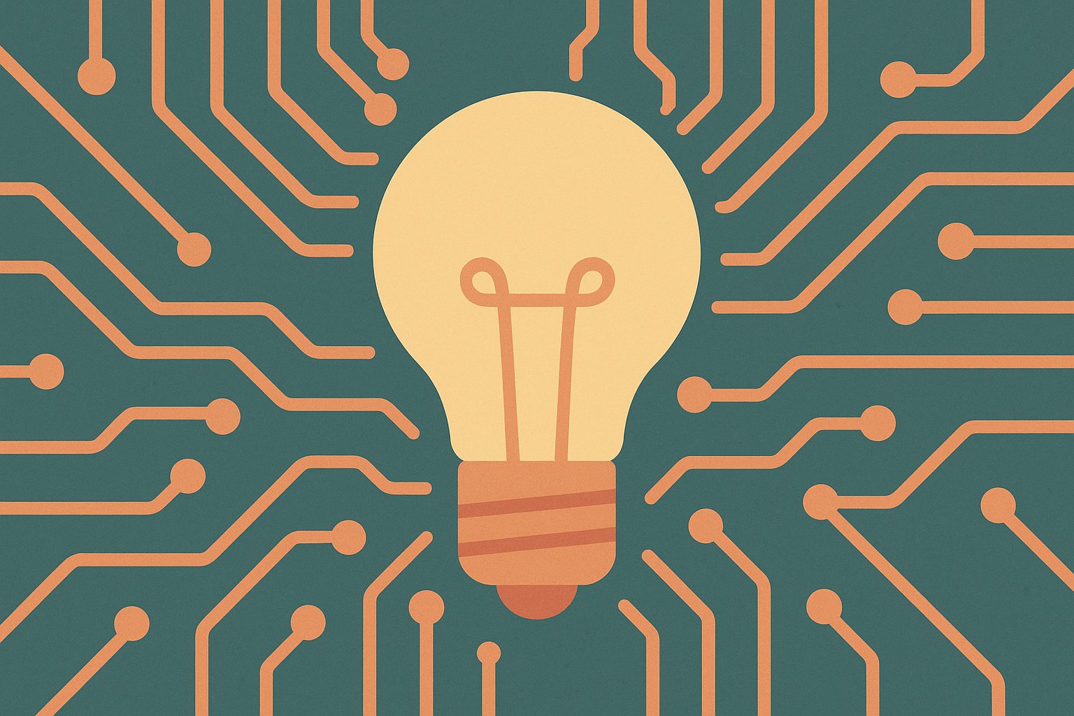 Illustration vectorielle douce avec des couleurs pastel (ocre, vert sauge, bleu ardoise, orange doux) représentant un bureau : plante en pot, écran avec graphique, ampoule, livres ouverts, horloge, pot à crayons, cafetière italienne. Style épuré et minimaliste, ambiance de travail créatif et chaleureux. Fond clair avec éléments disposés en bas, laissant de l’espace vide pour le texte.