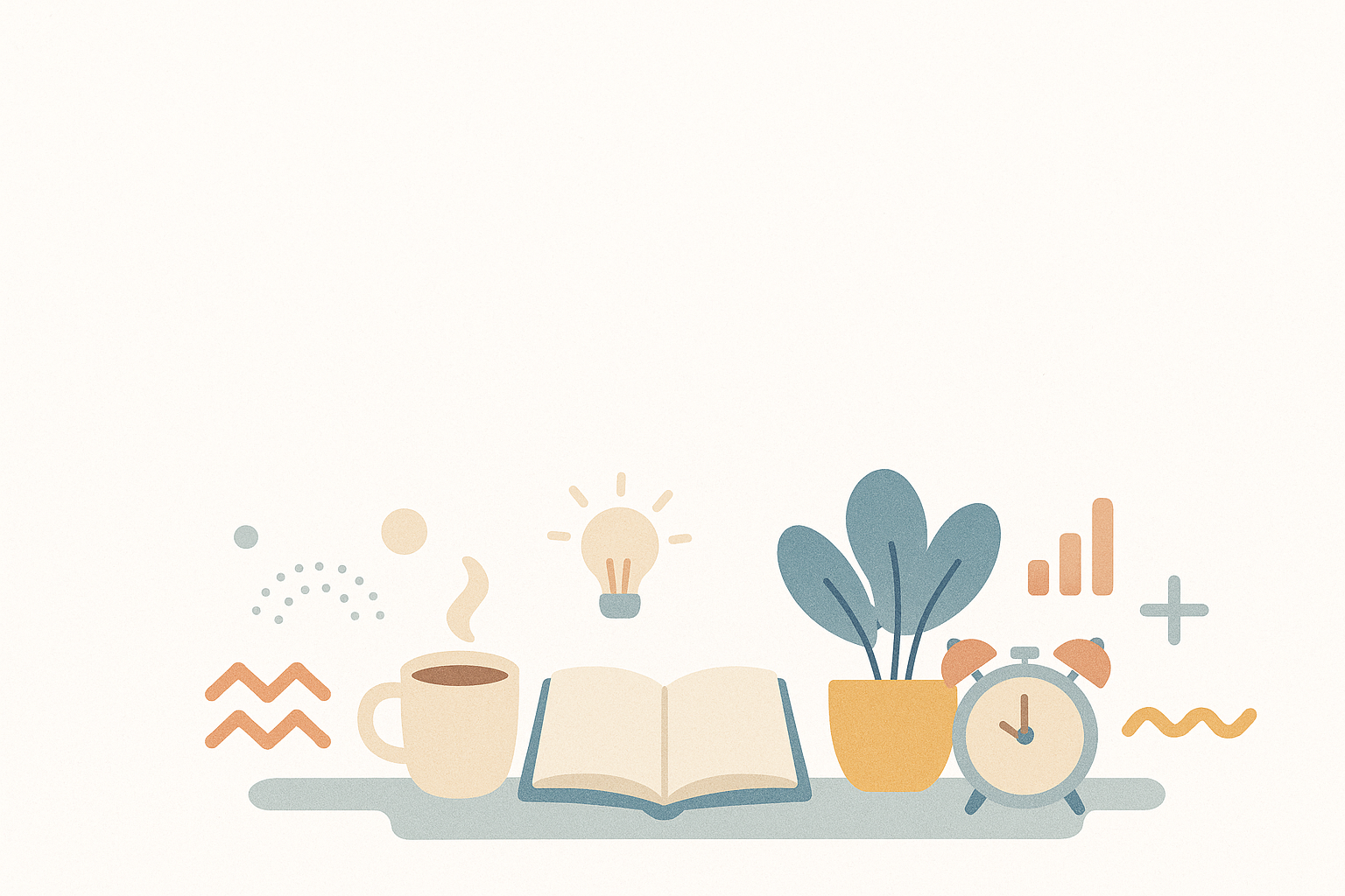 Illustration vectorielle minimaliste avec des tons pastel doux (beige, bleu, orange). Motifs de bureau : tasse de café fumante, livre ouvert, plante en pot, réveil, ampoule, graphiques et symboles abstraits. Style plat et épuré, ambiance calme et professionnelle, fond clair avec espace vide pour texte.