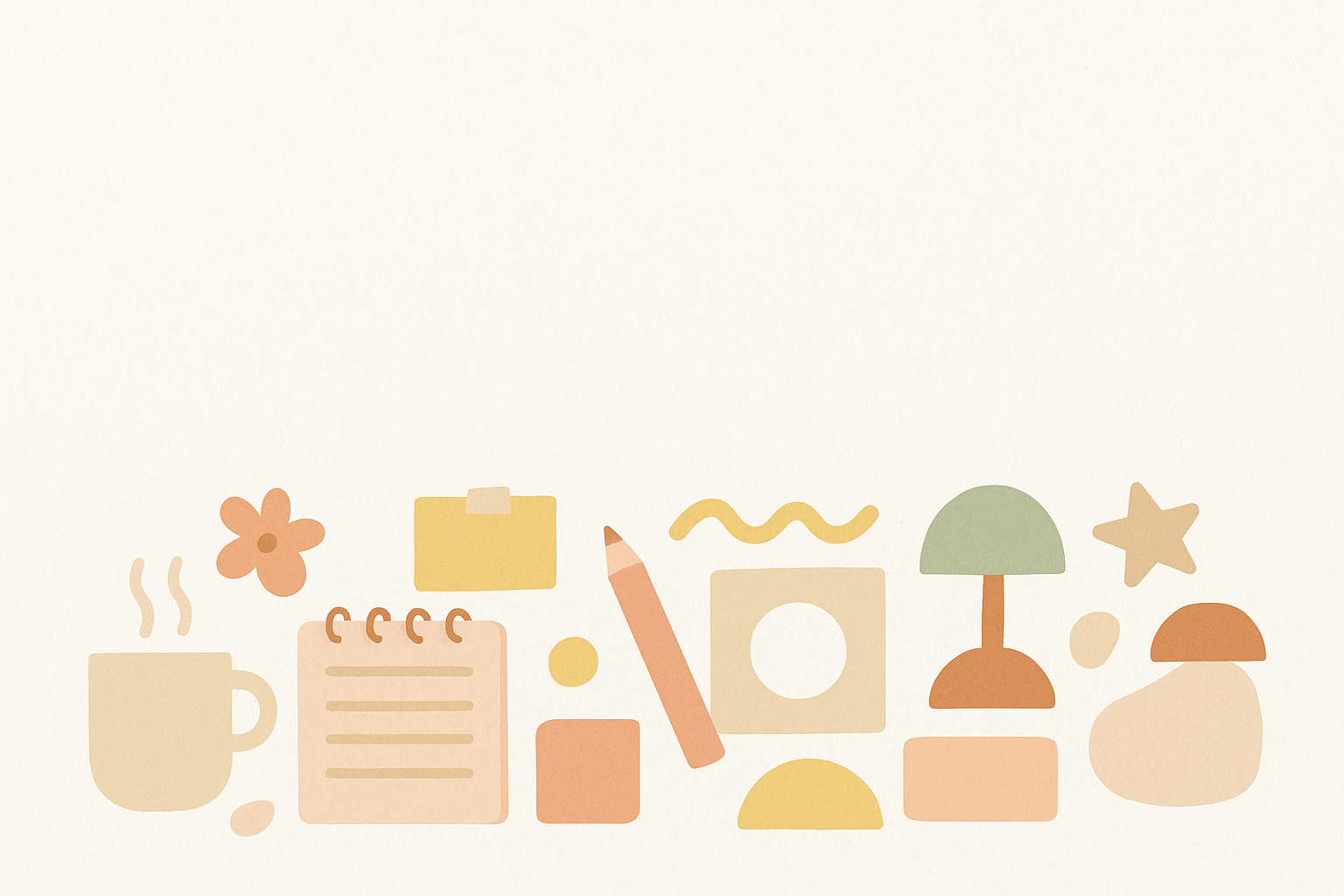 Illustration vectorielle minimaliste avec des icônes de bureau stylisées : tasse beige, carnet rose pâle, crayon orange, lampe vert sauge, dossier jaune, formes géométriques douces. Palette de couleurs pastel : beige, rose, jaune moutarde, vert doux, orange terre cuite. Fond crème uni, ambiance chaleureuse et professionnelle, style épuré et moderne.