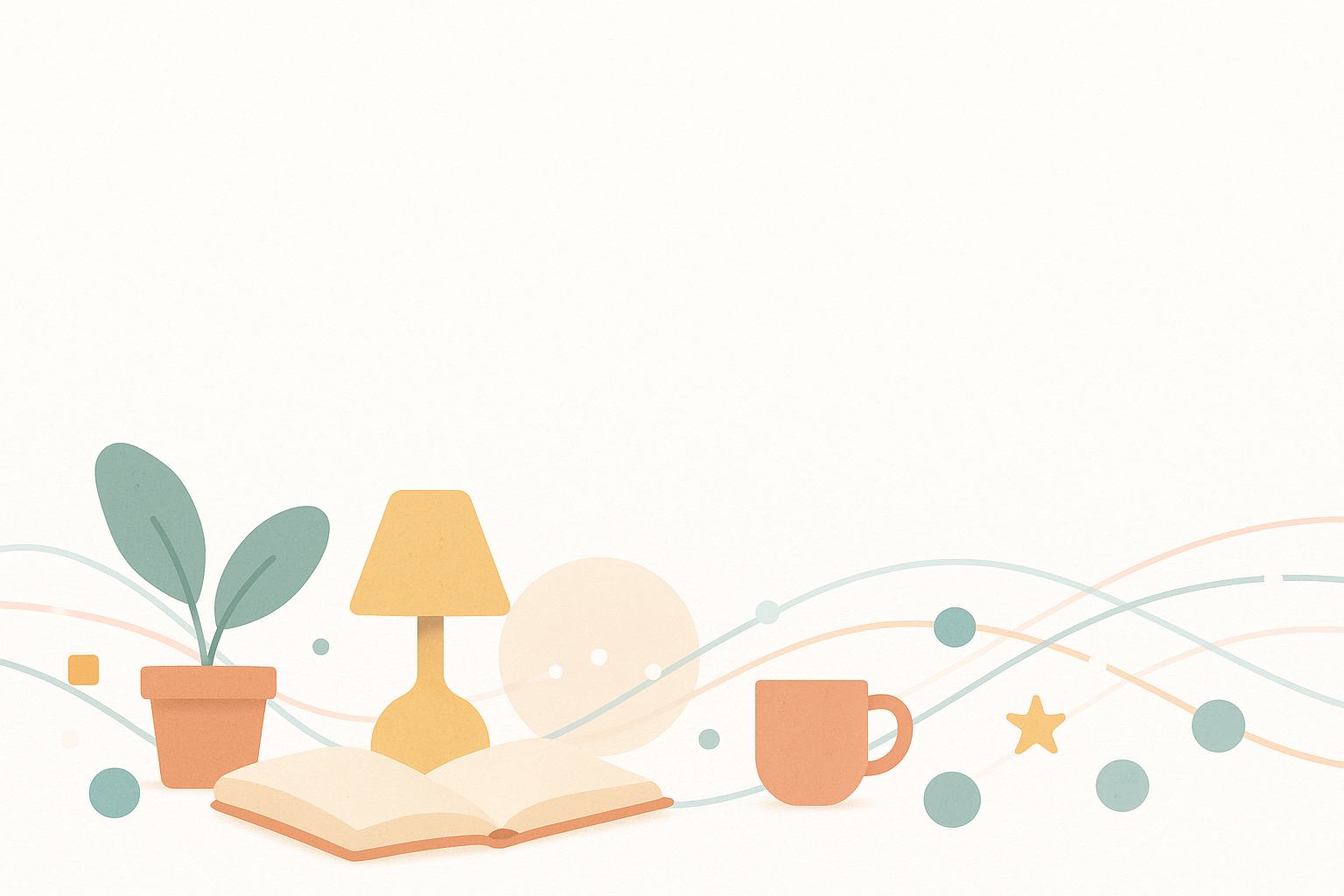 Illustration minimaliste aux tons pastel avec une lampe jaune, une plante en pot verte, un livre ouvert, une tasse orange et des lignes ondulées décoratives bleu clair et pêche. Des formes géométriques douces (cercles, étoiles, carrés) complètent la composition sur un fond crème texturé. Ambiance calme, professionnelle et créative idéale pour visuels de communication d'affaires.