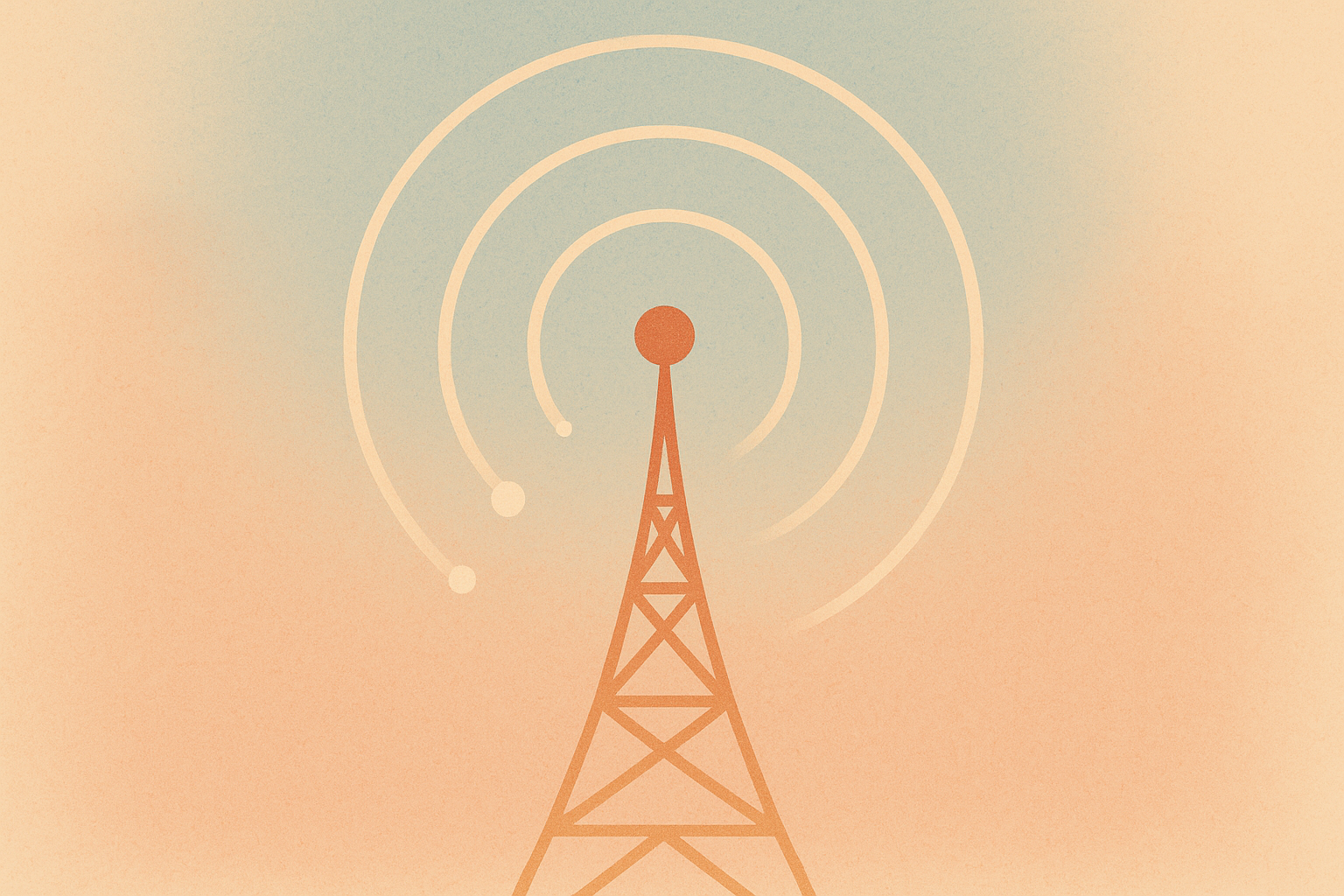 Illustration vectorielle dans des tons doux et chauds (beige, orange, vert, bleu-gris) représentant un bureau avec une tasse fumante, une plante verte, un ordinateur portable, une lampe de bureau orange, un carnet rouge et un crayon. Style minimaliste et épuré, ambiance cosy et professionnelle, fond clair avec espace vide en haut pour texte ou message personnalisé.