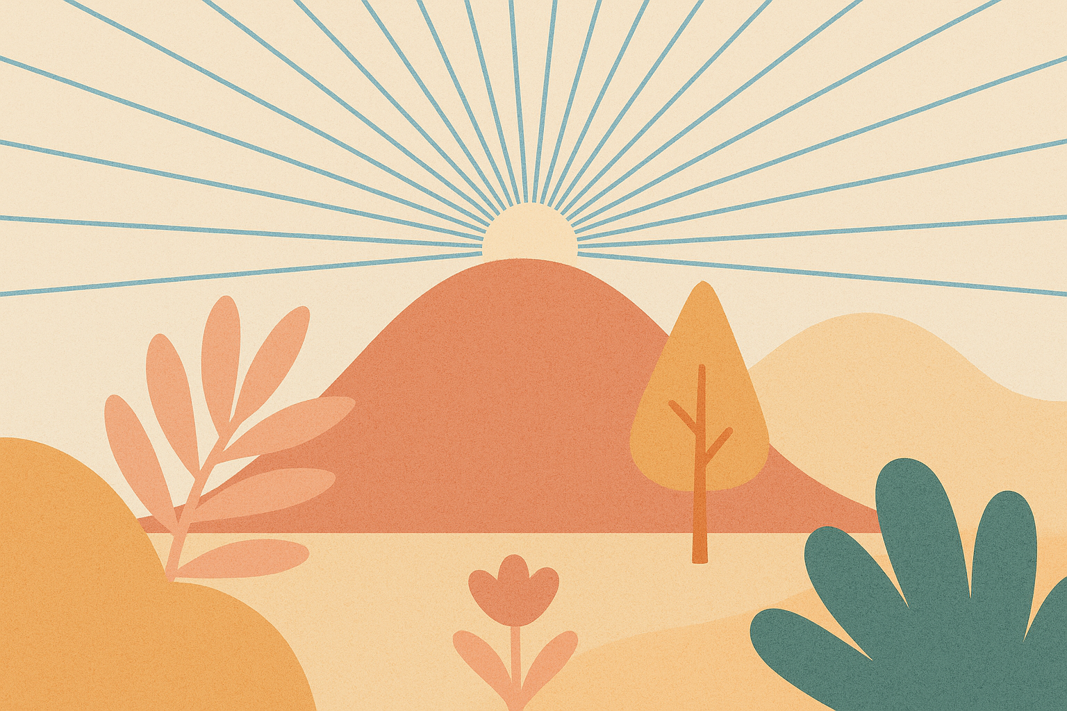 Illustration minimaliste sur fond crème avec lignes bleues rayonnantes depuis le centre supérieur, représentant une perspective dynamique. En bas, des éléments de bureau stylisés en tons chauds (orange, beige, ocre) et bleus doux : enveloppe avec plante, cadre, lampe, carnet, crayon, horloge, formes abstraites. Style graphique plat et pastel, ambiance calme et professionnelle.