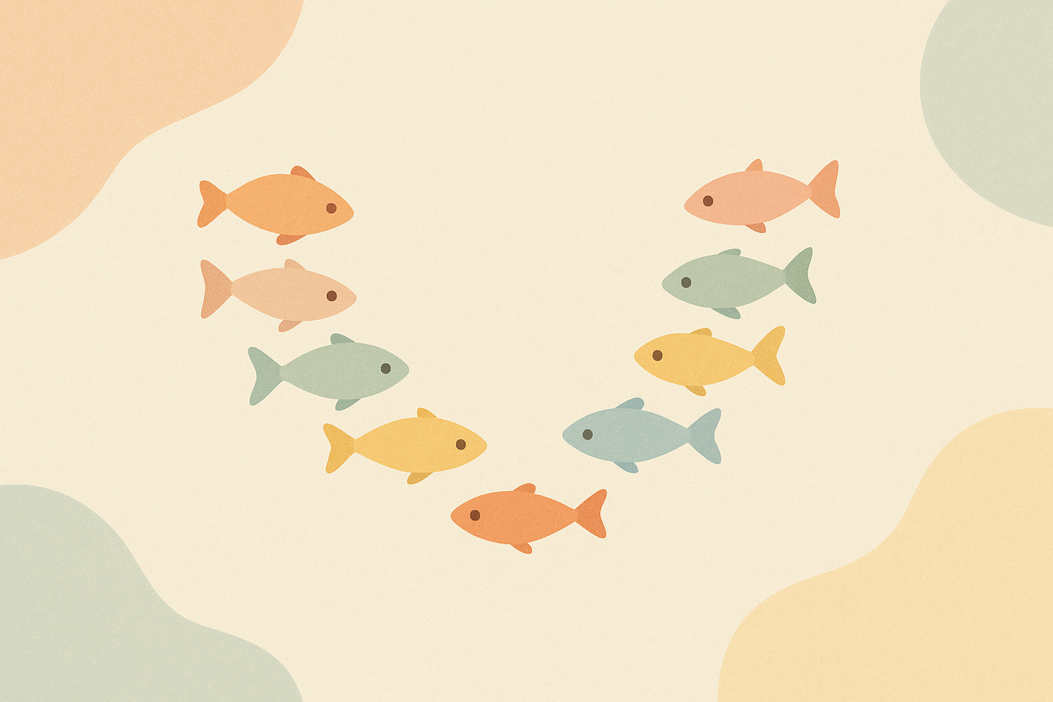 Illustration vectorielle minimaliste avec des formes géométriques plates représentant une tasse orange, un vase brun avec plante verte, une lampe de bureau, un livre ouvert, un cadre abstrait et des éléments décoratifs. Palette de couleurs douces et naturelles : beige, ocre, vert foncé, terracotta et bleu-gris. Style épuré, ambiance de bureau calme et contemporaine, fond crème uni avec espace vide pour texte.