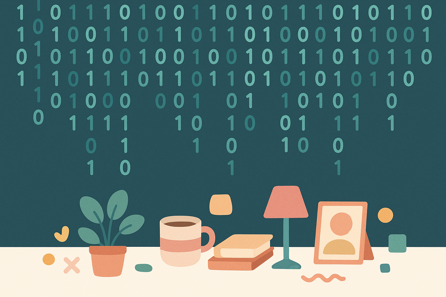 Illustration vectorielle au style plat avec un fond bleu-vert foncé parsemé de chiffres binaires (0 et 1) en dégradé turquoise. En bas, une scène de bureau avec une plante en pot, une tasse rayée rose et beige, des livres empilés, une lampe de table rose et verte, un cadre photo, et divers éléments décoratifs abstraits. Palette de couleurs douces pastel : vert sauge, rose saumon, beige crème et orange doux. Ambiance calme, professionnelle et numérique.