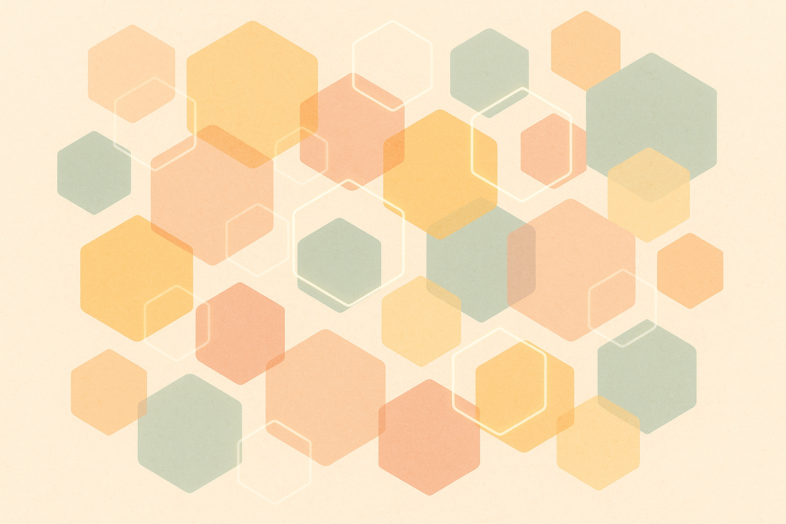 Illustration vectorielle minimaliste avec des tons pastel doux (vert sauge, beige, jaune moutarde, orange clair). Éléments visuels : enveloppe, dossier, graphique circulaire, document, flèche ascendante, plante en pot, engrenage et histogramme. Ambiance professionnelle, épurée et moderne, parfaite pour un fond de carte postale d'entreprise ou de communication commerciale.