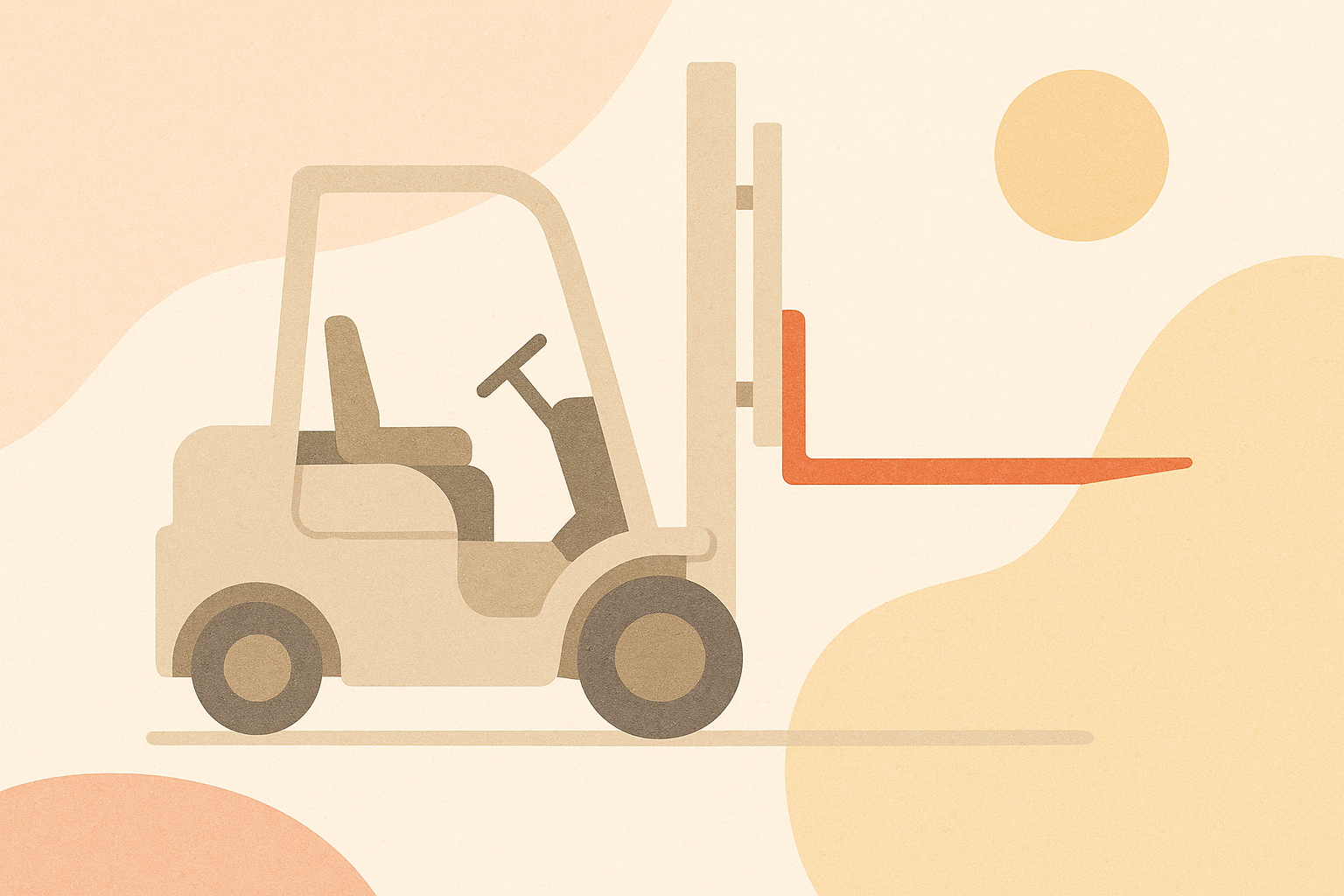 Illustration minimaliste d’un chariot élévateur en ligne fine gris clair sur fond beige, accompagnée d’éléments graphiques géométriques en tons pastel (orange doux, bleu pâle, beige sable). Motifs de boîte, engrenage, flèches, coche et formes abstraites évoquant la logistique, l’expédition et la gestion industrielle. Style épuré et professionnel, parfait pour les visuels de communication B2B.