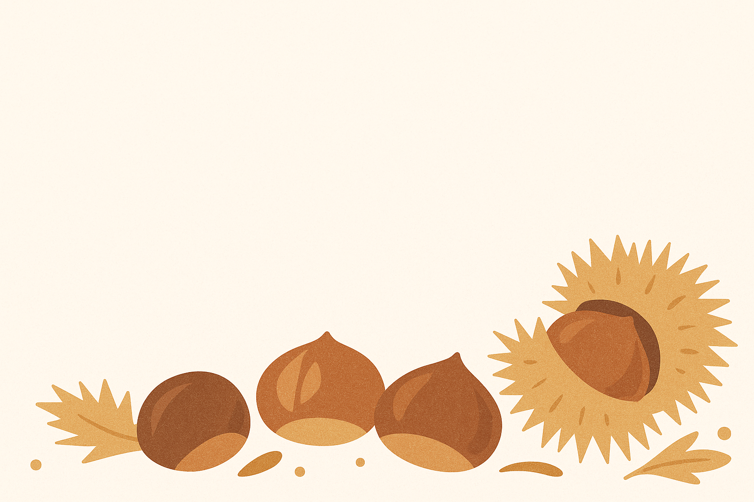 Illustration vectorielle de châtaignes marron et beige sur fond crème, avec coques hérissées, feuilles stylisées et éléments automnaux. Palette de couleurs chaudes : brun, ocre, beige. Style minimaliste, épuré et naturel, avec composition centrée en bas laissant un grand espace vide pour le texte.
