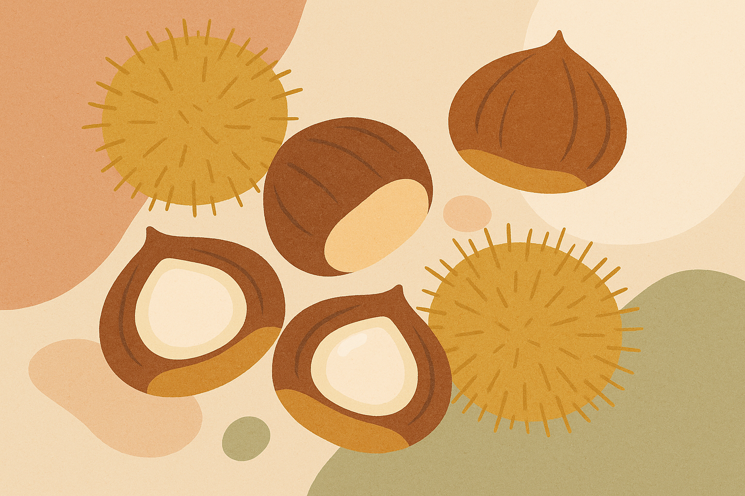 Illustration vectorielle de trois châtaignes ouvertes dans leurs bogues, aux tons doux beige, brun, vert olive et ocre. Le fond crème uni met en valeur les formes arrondies et les piquants stylisés des coques. Style minimaliste et organique, parfait pour des visuels d'automne ou de nature sur cartes postales professionnelles.