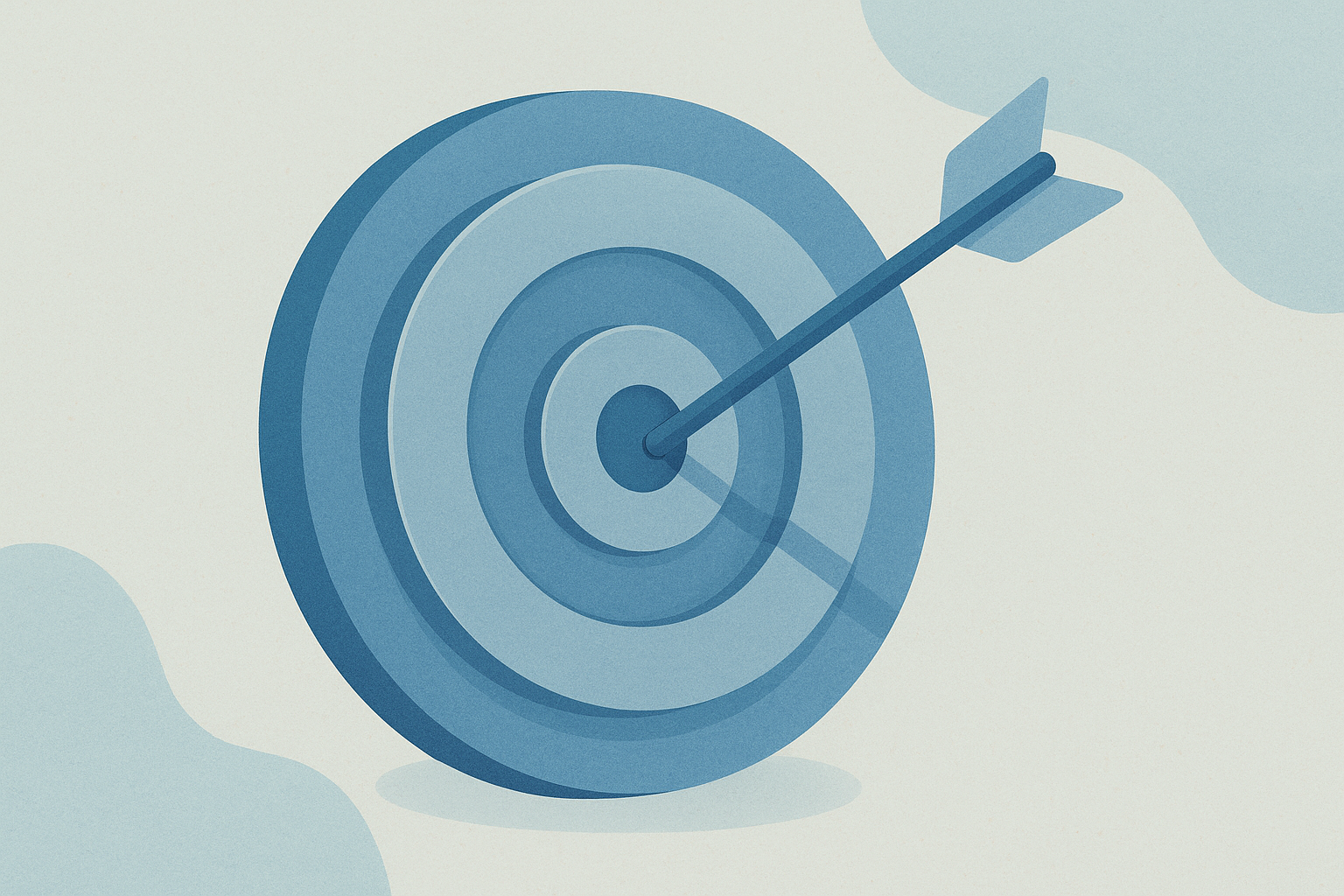 Illustration vectorielle en tons pastel bleu et beige avec une grande cible centrale touchée par une flèche. En bas, une série d’icônes stylisées : graphique circulaire, plante en pot, ampoule, graphique en barre, engrenage, flèche ascendante, bulle de dialogue et enveloppe. Style épuré, professionnel et moderne, parfait pour visuels de communication d’entreprise.