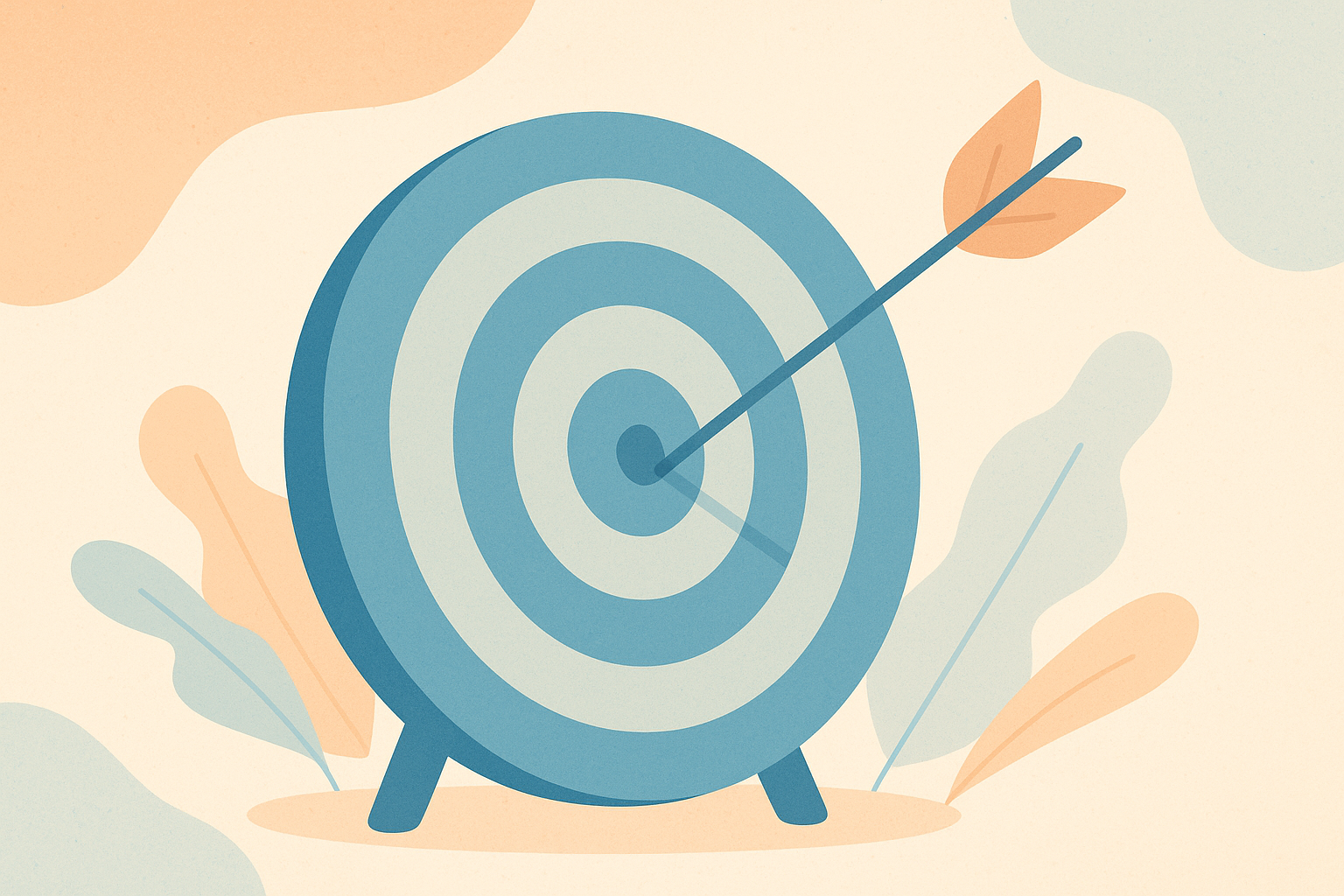 Illustration vectorielle sur fond beige clair avec une grande cible bleue centrée et une flèche atteignant le centre. En bas, une série d’icônes pastel (bleu, orange, beige) représentant un cheval de jeu d’échecs, un drapeau, un graphique circulaire, des montagnes avec drapeaux, une ampoule, un engrenage et des graphiques de croissance. Style plat, minimaliste et professionnel, parfait pour des visuels d'affaires et de stratégie.