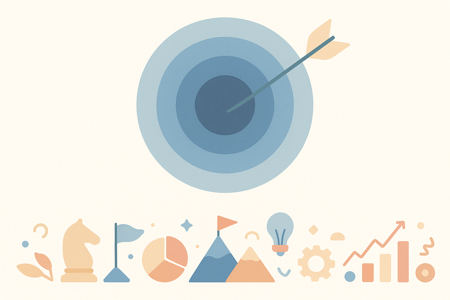 Illustration vectorielle sur fond beige clair avec une grande cible bleue centrée et une flèche atteignant le centre. En bas, une série d’icônes pastel (bleu, orange, beige) représentant un cheval de jeu d’échecs, un drapeau, un graphique circulaire, des montagnes avec drapeaux, une ampoule, un engrenage et des graphiques de croissance. Style plat, minimaliste et professionnel, parfait pour des visuels d'affaires et de stratégie.