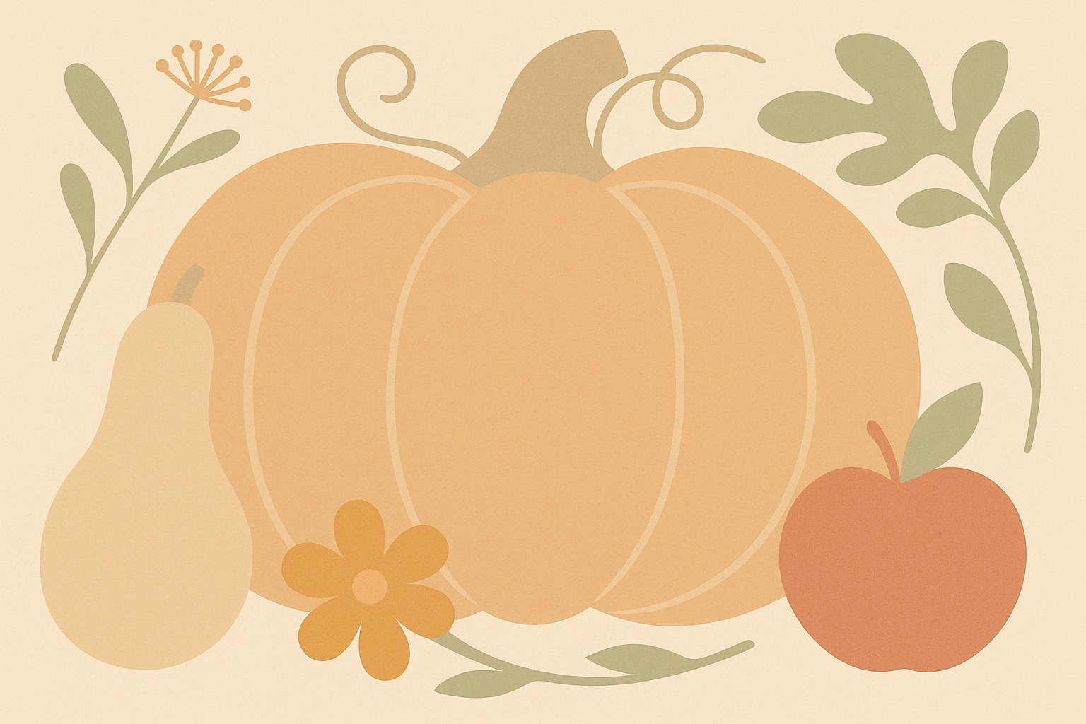 Illustration graphique dans des tons pastel doux (orange, beige, vert olive) représentant une grande citrouille décorative avec des motifs tourbillonnants, entourée de feuilles d'automne, champignon, tasse, bougie, gland, cœur et éléments naturels. Style minimaliste et chaleureux, ambiance automnale idéale pour correspondance professionnelle saisonnière.