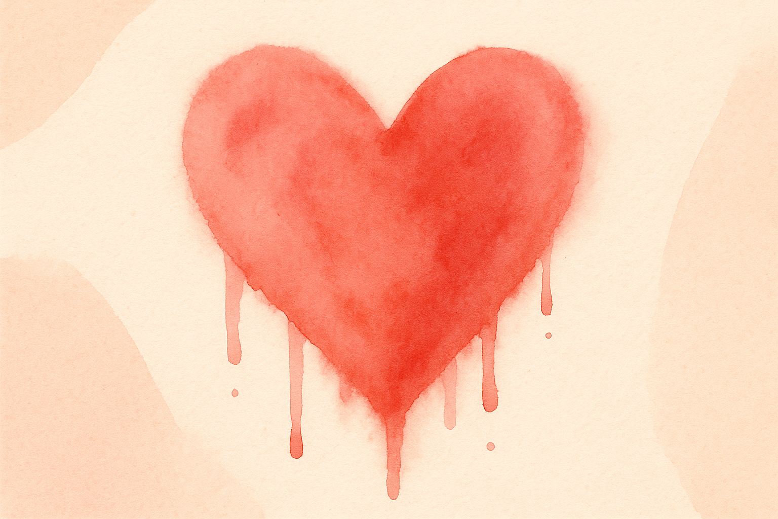 Illustration avec un grand cœur rouge en aquarelle au centre, légèrement flou avec effet de coulure. En bas, une frise décorative composée d’éléments minimalistes : plante verte en pot, bougie, livres empilés, tasse, arc-en-ciel, cadre avec cœur, tapis, et petits symboles abstraits. Palette de couleurs pastel : rouge brique, vert sauge, jaune moutarde, beige et rose doux. Style épuré, chaleureux et artistique sur fond blanc texturé.