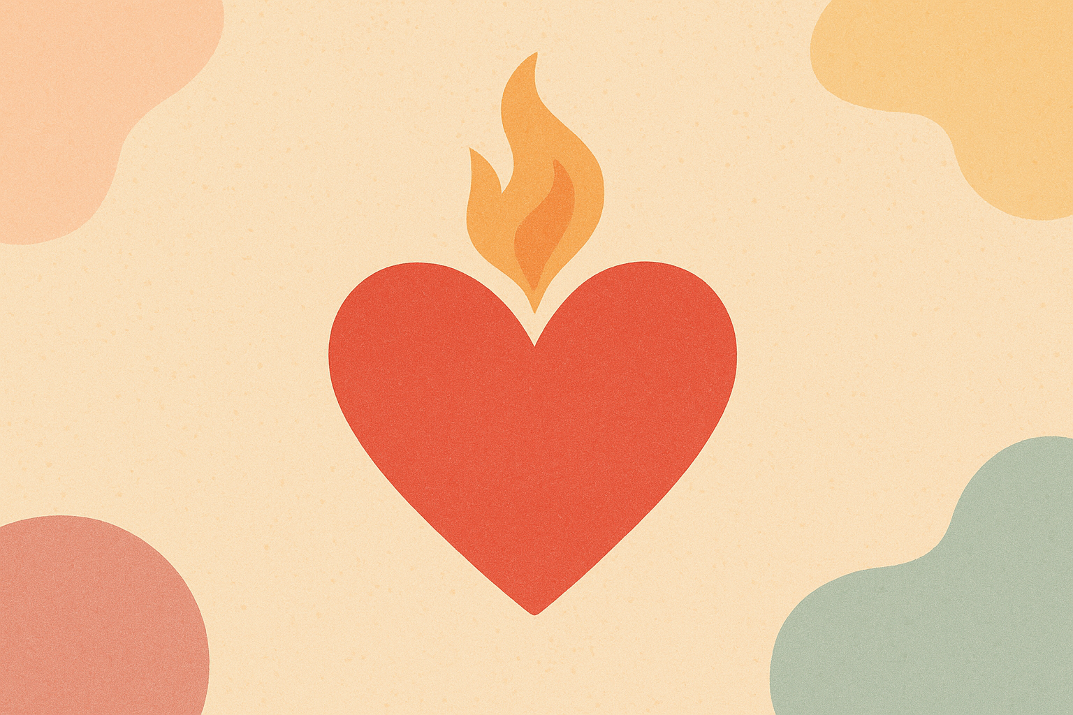 Illustration minimaliste avec un grand cœur rouge central sur fond crème, entouré d’éléments doux comme une enveloppe jaune, une fleur rouge, un visage souriant, une tasse beige, des feuilles vertes et des formes abstraites pastel. Palette de couleurs chaudes et naturelles (rouge, orange, vert, beige), style plat et épuré, ambiance chaleureuse et positive.