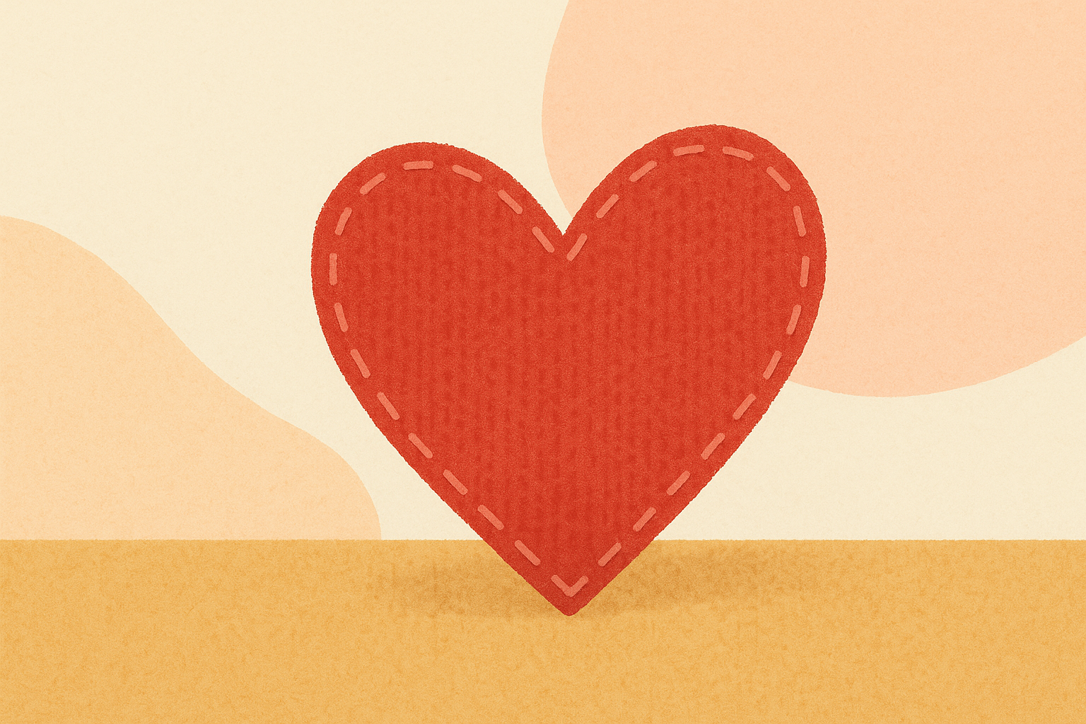 Illustration douce avec un grand cœur rouge cousu au centre, entouré d’éléments de couture stylisés : bobine de fil orange, aiguille, ciseaux jaunes, boutons orange et saumon, feuilles vertes et confettis colorés. Palette pastel avec fond crème, style dessiné à la main évoquant la créativité, la douceur et l’artisanat. Composition équilibrée et visuellement engageante pour un usage professionnel chaleureux.