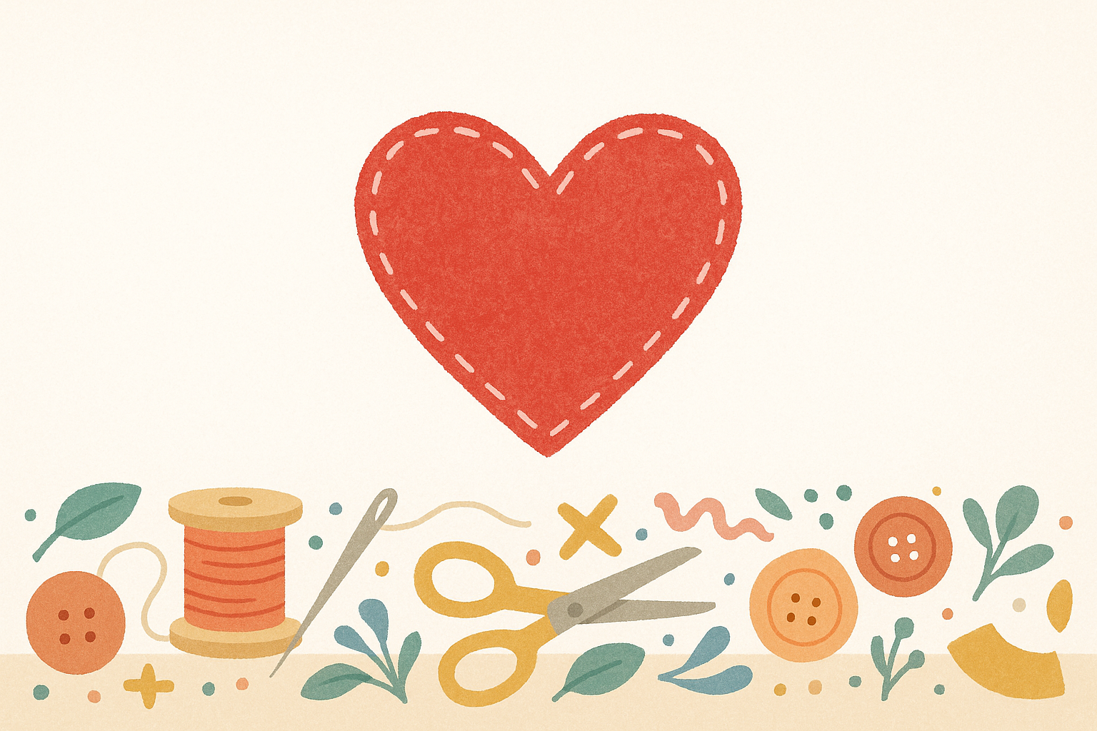 Illustration douce avec un grand cœur rouge cousu au centre, entouré d’éléments de couture stylisés : bobine de fil orange, aiguille, ciseaux jaunes, boutons orange et saumon, feuilles vertes et confettis colorés. Palette pastel avec fond crème, style dessiné à la main évoquant la créativité, la douceur et l’artisanat. Composition équilibrée et visuellement engageante pour un usage professionnel chaleureux.